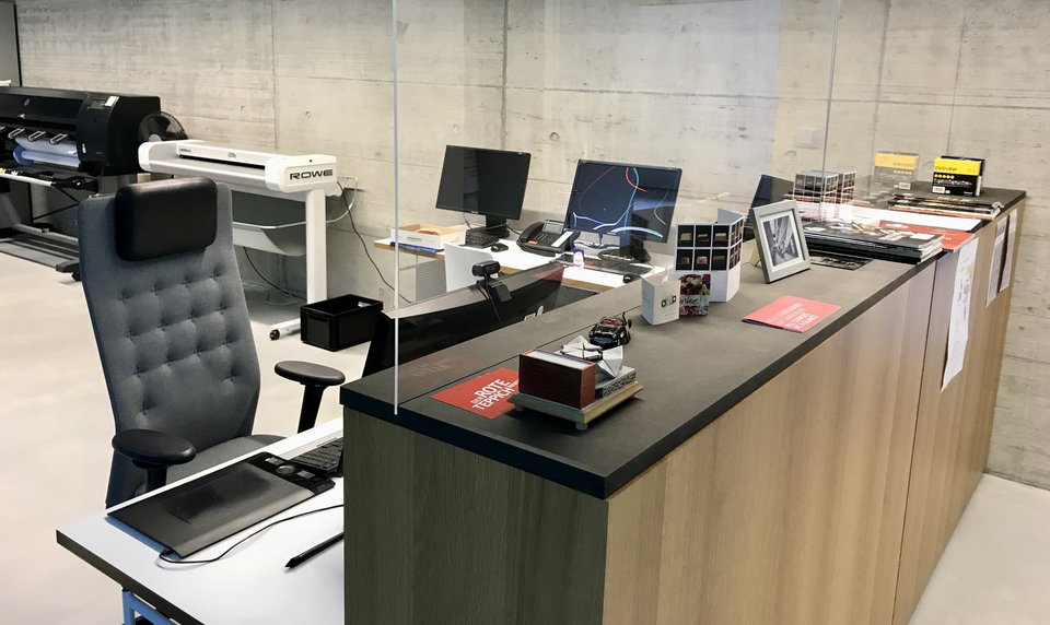 Bitte die Studierendenkarte in Bau 1 aufladen. Die Einrichtung wird durch fachkundiges Servicepersonal betreut. Studierende können dadurch bei Layout und Umsetzung ihrer Plots unterstützt werden.