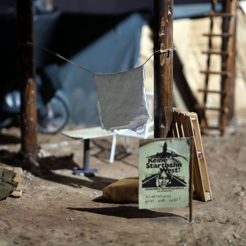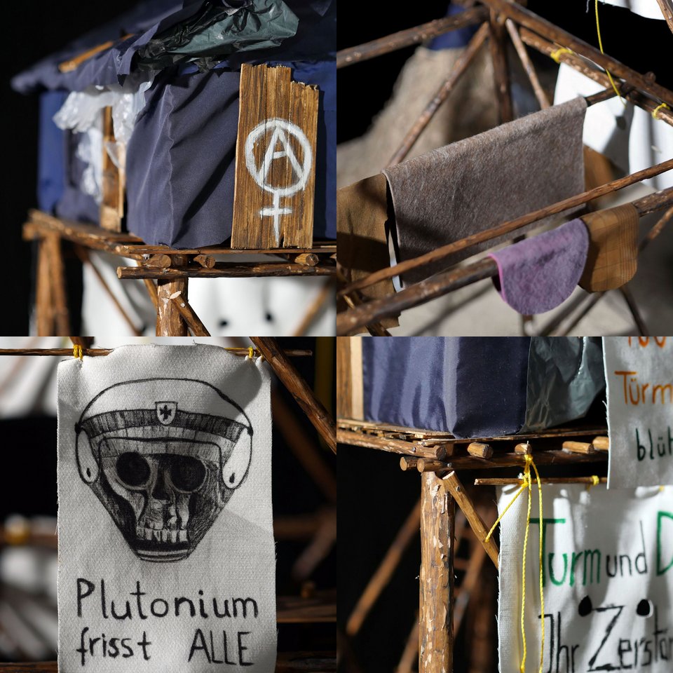 Detailreiche Modelle, gebaut unter Leitung von Professor Andreas Kretzer an der Technischen Universität München und der Hochschule für Technik Stuttgart zeigen Protestcamps von der Resurrection City 1968 bis zur Lobau-bleibt!-Bewegung 2021/2022. Vierzig »Bodenstrukturen« aus Lützerath, zumeist Pfahlbauten, wurden von Rokas Wille (HfG Karlsruhe) mit Fotopapiermodellen dokumentiert.