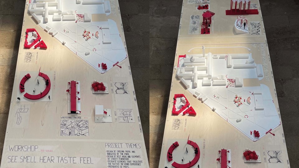 Im März diesen Jahres startete die HFT-Biennale-Tour 2023 mit dem Auftaktprojekt MAKE+ am Campo San Lorenzo und im Salone Verde. Auf der zweiten Etappe vom 29.05.-04.06.2023 haben die Teilnehmer:innen architektonische Antworten für die Wahrnehmung von Lebensräumen für Menschen mit sensorischen Einschränkungen gesucht. “See Smell Hear Taste Feel” war das Thema dieses internationalen Workshops.