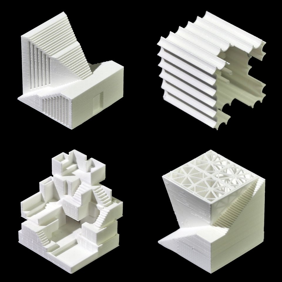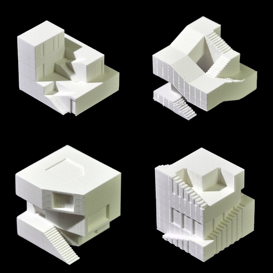 Innerhalb eines gegebenen Volumens von 10 x 10 x 10 Meter entwarfen die Studierenden im ersten Semester des Bachelor-Studiengangs Innenarchitektur Räumlinge (ein Begriff, der vom Schweizer Architekten Andrea Deplazes stammt) – ungewöhnliche Räume mit spezifischen Eigenschaften. In der Werkstatt wurden diese als präzise Architekturmodelle im FDM-Verfahren (Fused Deposition Modeling) gedruckt.