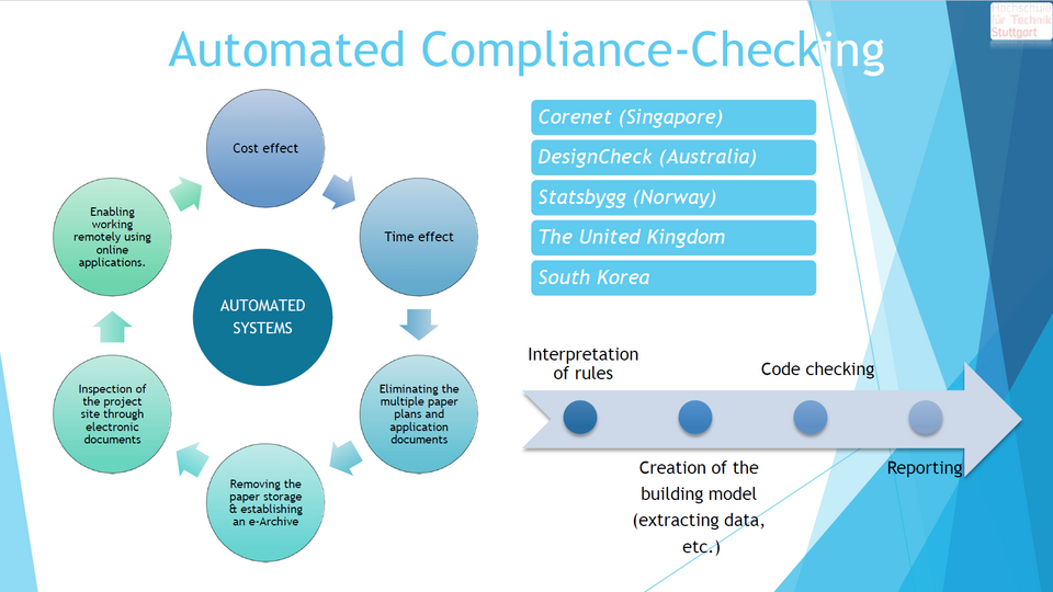 In this study, an online questionnaire is conducted to understand the status quo in Baden-Württemberg (BW). Additionally, the applicable building code was studied to understand the extent of its convertibility into a machine-readable format. A data discovery and visualization tool, Qlik Sense, is used to analyze the building regulations and encoding due to its simplicity in usage, cloud-based application model and flexibility. Subsequently the initial coding has been prepared for the selected regulations, and the model framework has been created. The sample data has been processed via de Qlink Sense application, and the compliance check was executed. Through the coding prepared, the initial automated compliance checking has been achieved, and the control data have validated the correctness of the results.