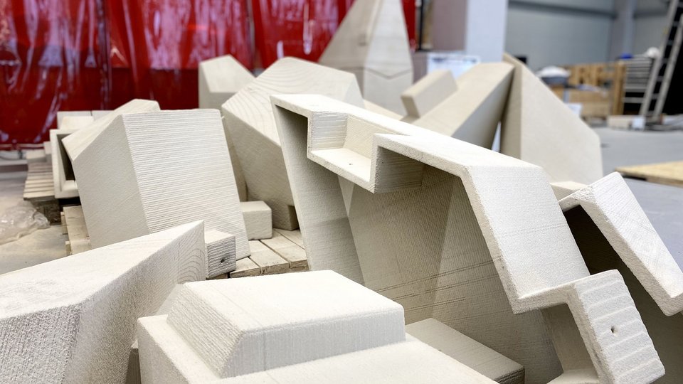 Hierbei wird Schicht für Schicht ein ECONIT-Pulver aufgetragen und mittels eines Aktivators gebunden (Pulverbettverfahren).