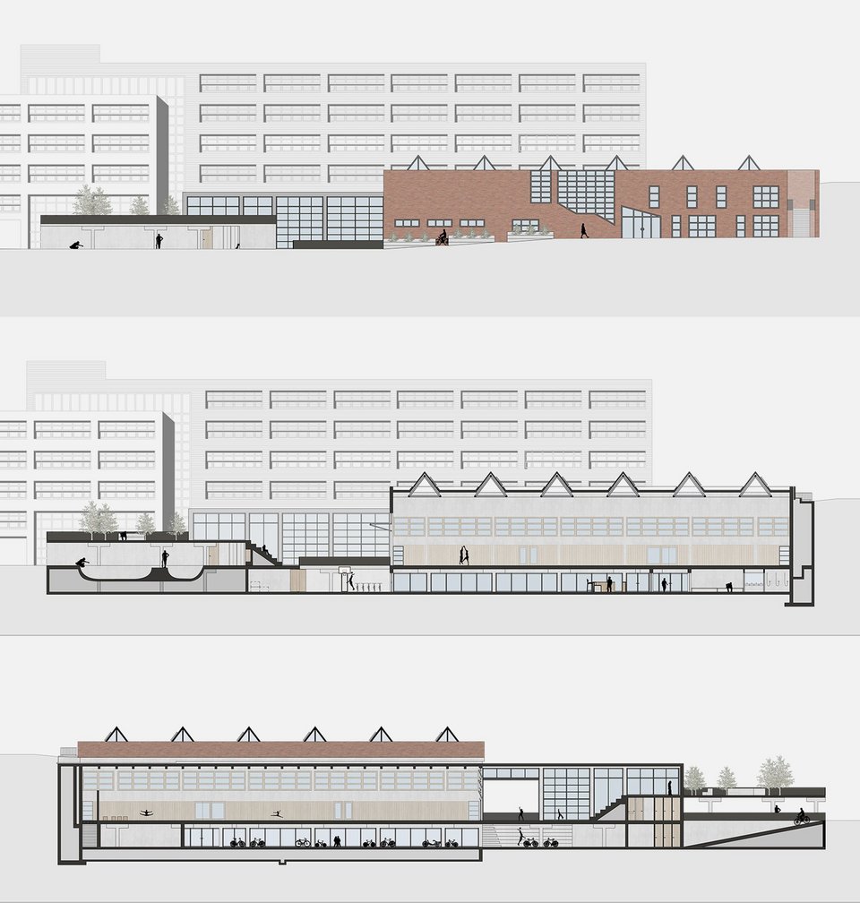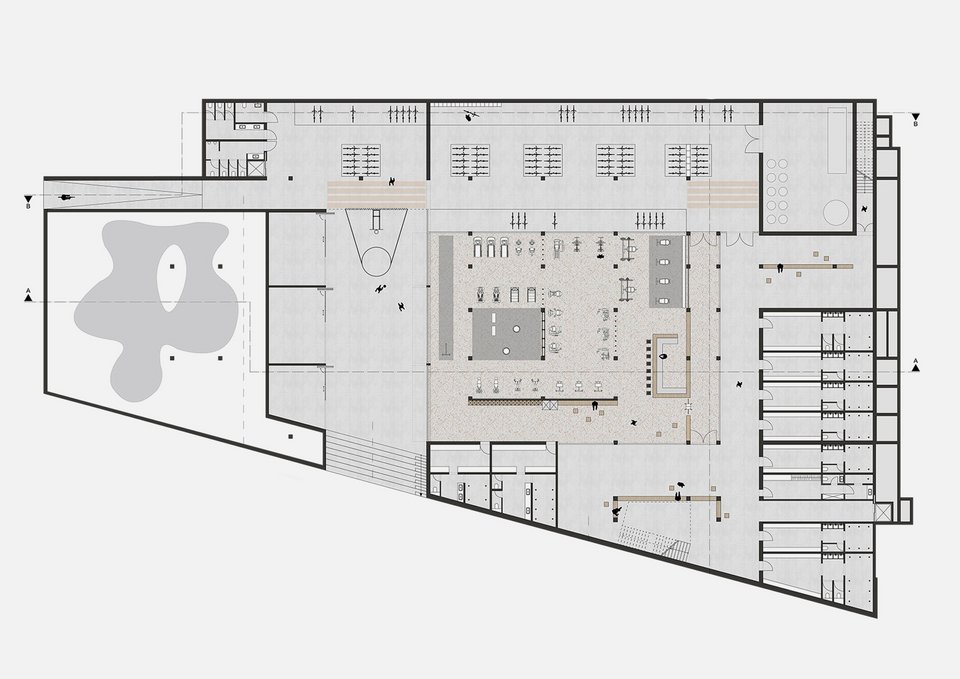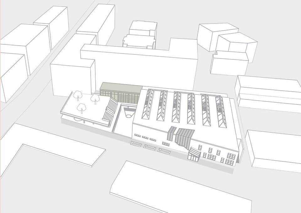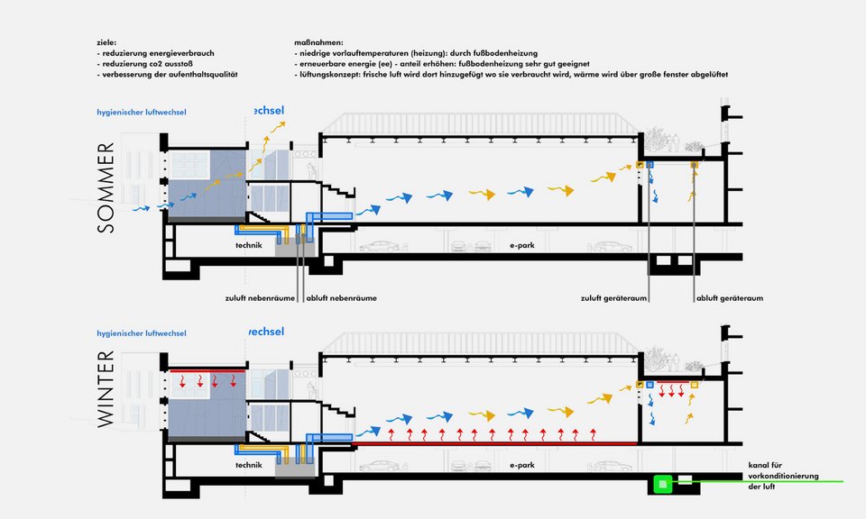 Neben überschaubaren architektonischen Eingriffen und additiven Maßnahmen im Außenraum wurde auch der Bestand der Halle reorganisiert und neu gedacht sowie das Energiekonzept neu konzipiert.