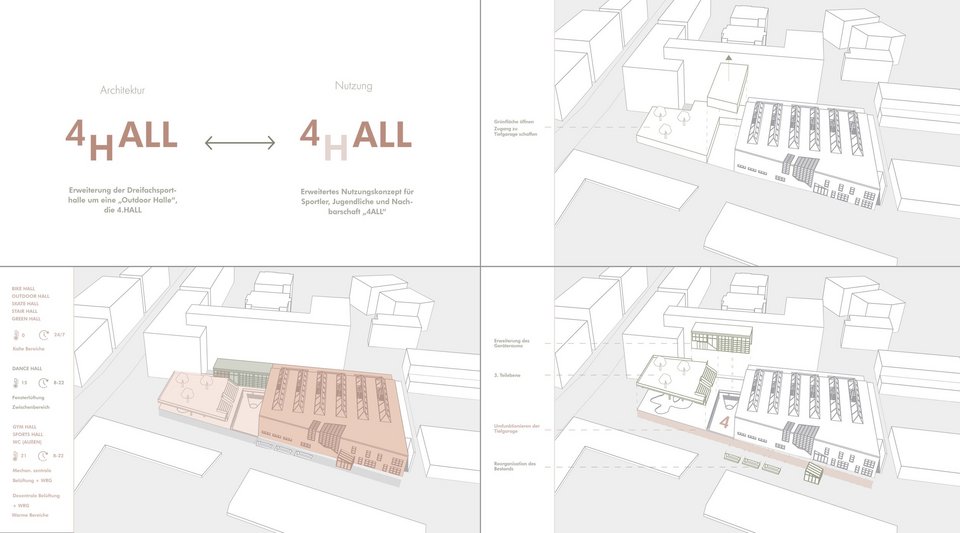 Im Rahmen des Kooperationsprojektes IMAKE ist das ganzheitliche Umnutzungskonzept „4 Hall“ der Tivoli-Sporthalle im Stuttgarter Westen entstanden. Der Entwurf bietet Raum für Lebensfreude sowie diverse Sportarten mit dem Fokus auf eine zukunftsfähige Vision für die Belebung des Quartiers mit Nutzen für junge Menschen, Sportler und die Nachbarschaft.