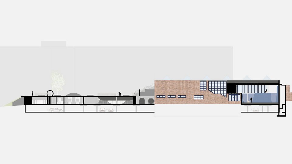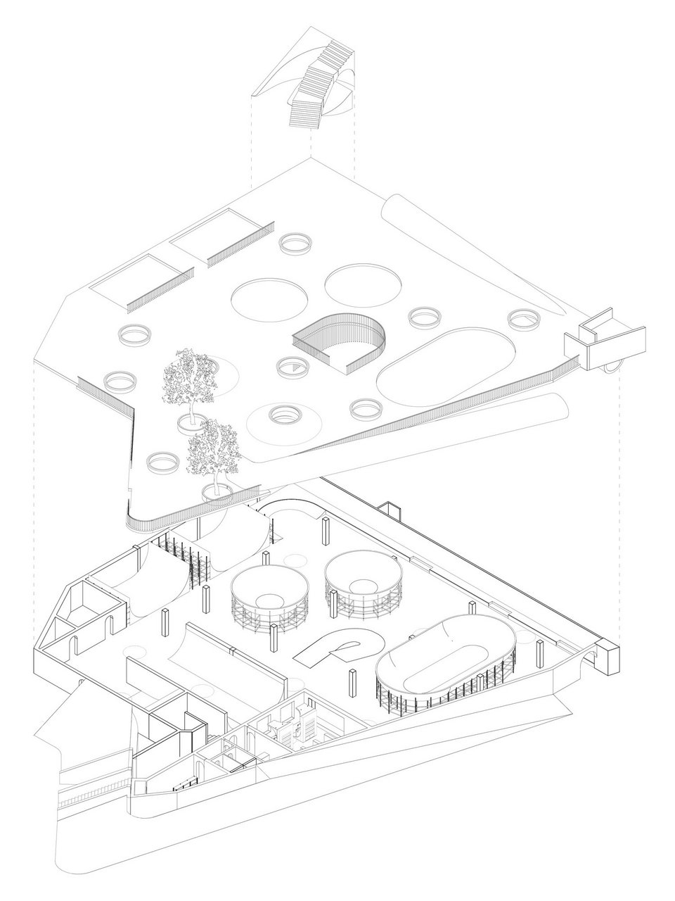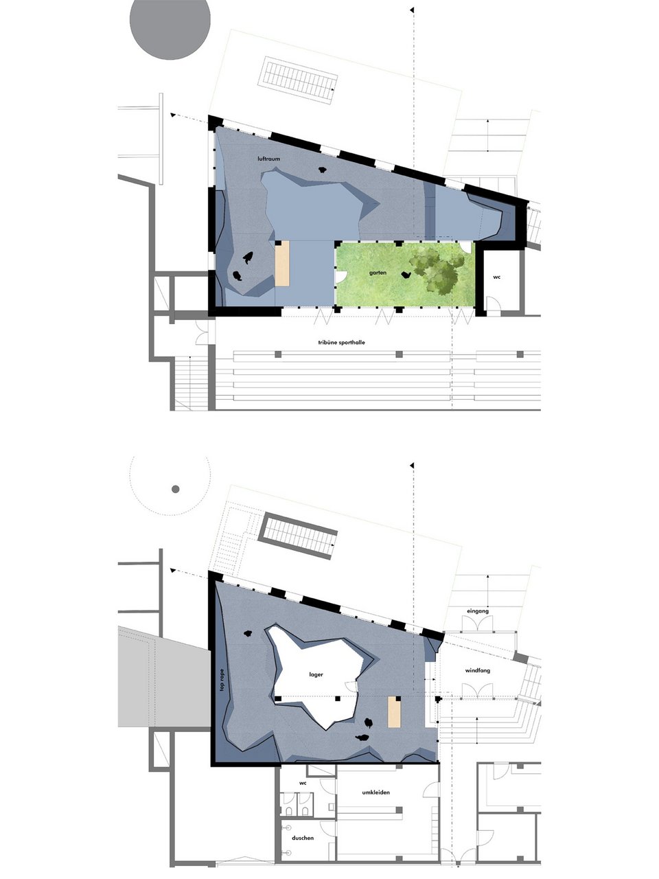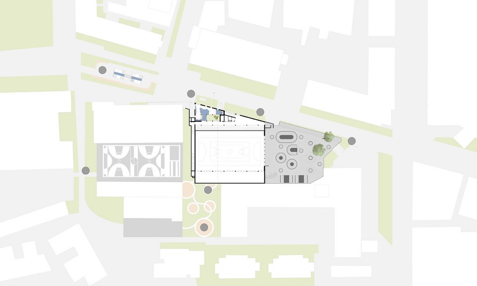 Die Dreifachsporthalle Tivoli in der Forststraße 15 wurde 1986-88 von der Architektenpartnerschaft Heckmann.Kristel.Jung erbaut und wird ausschließlich für den Schul- und Vereinssport genutzt. In den 70er und 80er Jahren entstanden im Stadtgebiet von Stuttgart sehr viele Sporthallen, die alle in den nächsten Jahren saniert werden müssen. Von Seiten der Verwaltung, dem Amt für Sport und Bewegung der Stadt Stuttgart, gibt es Überlegungen, diese Hallen nicht nur energetisch zu sanieren, sondern in diesem Zuge auch über erweiterte Nutzungen nachzudenken. Gedacht sind Nutzungen, die das soziale Miteinander im unmittelbaren Umfeld der Sporthallen fördern, vor allem in den Wohngebieten. Die Freiräume um die Sporthallen herum sollen ebenfalls in die Planungen mit einbezogen werden. Die Tivolihalle ist einer dieser Hallen, die demnächst zur Sanierung ansteht. Sie liegt im Stuttgarter Westen in unmittelbarer Nachbarschaft des Boschareals. Angrenzend gibt es eine Berufsfachschule, Grundschule und ein Gymnasium. Gebaut wurde die Halle über einer Tiefgarage mit Schutzräumen. Jedoch ist nicht die gesamte Tiefgaragenfläche überbaut worden. Im Osten gibt es eine große erhöhte Freifläche, bislang ohne Nutzung. Diese Fläche soll in die Überlegungen mit einbezogen werden, um das vorhandene Raumprogramm zu erweitern.