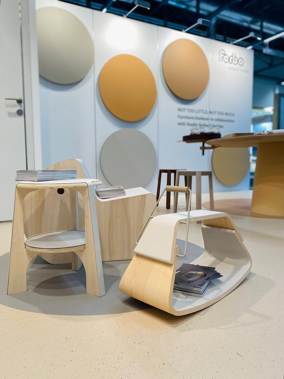 Anschließend erforschten sie die funktionalen Eigenschaften und Potenziale von Boden-, Möbel- und Pinnwand-Linoleum durch praktische Experimente und eine methodische Herangehensweise im Rahmen eines Seminars mit der Materialforscherin Dr. Kerstin Mayer. Aufgabe im anknüpfenden materialbasierten Semesterentwurf war es, neue funktionale Einsatzbereiche zu entwickeln und ein Kleinmöbel oder Produkt der Wahl mit Linoleum zu entwerfen. Das Linoleum konnte mit neu entworfenen Elementen und einem zusätzlichen ökologisch sinnvollen Material kombiniert und ergänzt werden. Das Projekt wurde großzügig von Forbo unterstützt. Die Designmodelle im Maßstab 1:1 enstanden mit tatkräftiger Unterstützung des HFT-Werkstattteams, insbesondere Romano Bianchi, Willi Mauch und Holger Bitterberg, sowie begleitet durch Jürgen Aldinger. Anschließend wurden die Möbel von den Studierenden in einem Fotoworkshop mit Dipl.-Designer/ Fotograf Philip Kottlorz dokumentiert und vom 10.-12. März 2023 auf der BLICKFANG Designmesse, sowie vom 9.-12. Mai 2023 auf der INTERZUM Köln ausgestellt.