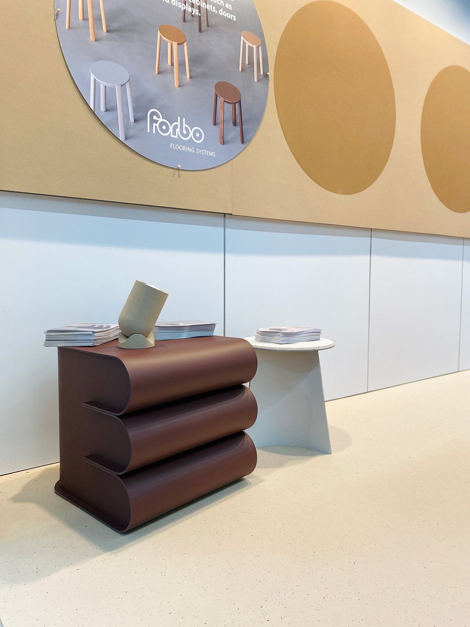 Bulletin Board. Mit 6mm ist Pinnwand-Linoleum das dickste Linoleum-Produkt von Forbo. Bislang wird es jedoch hauptsächlich zweidimensional eingesetzt. Der „Dot Stool“ untersucht die Möglichkeit einer dreidimensionalen Verwendung und zeigt Gestaltungsmöglichkeiten auf, wie ein homogenes Volumen entstehen kann. Der „Dot Stool“ besteht aus 76 verklebten Schichten Pinnwand-Linoleum, abgeschlossen durch einen mittig sitzenden Holzstab, welcher die einzelnen Schichten vor einer horizontalen Verschiebung sichert.