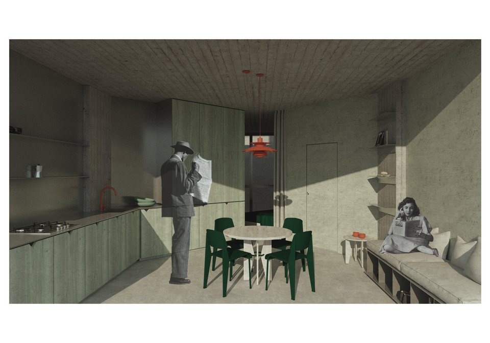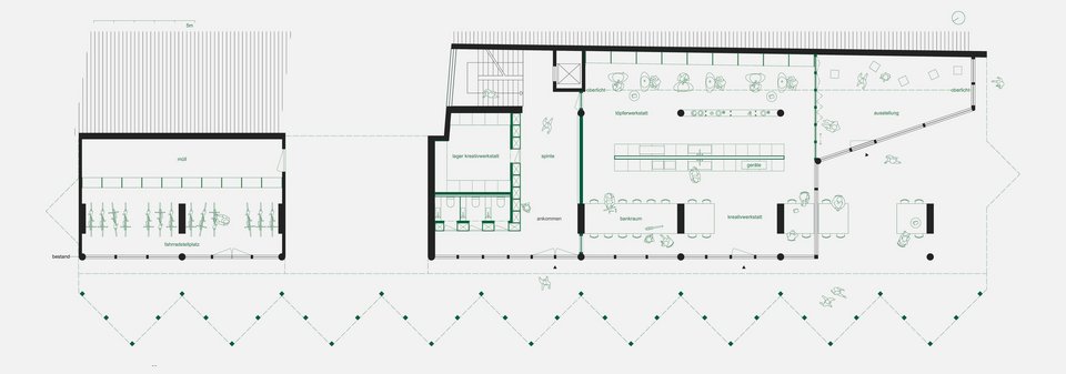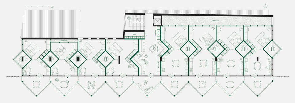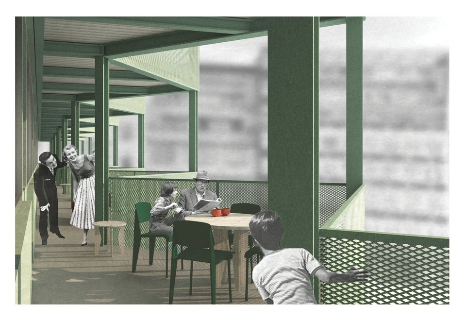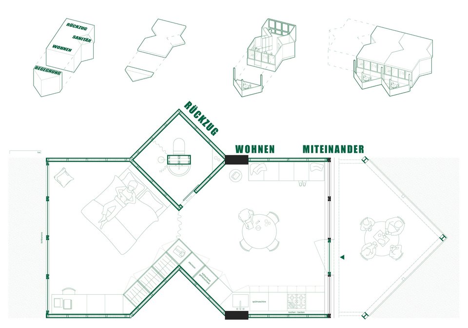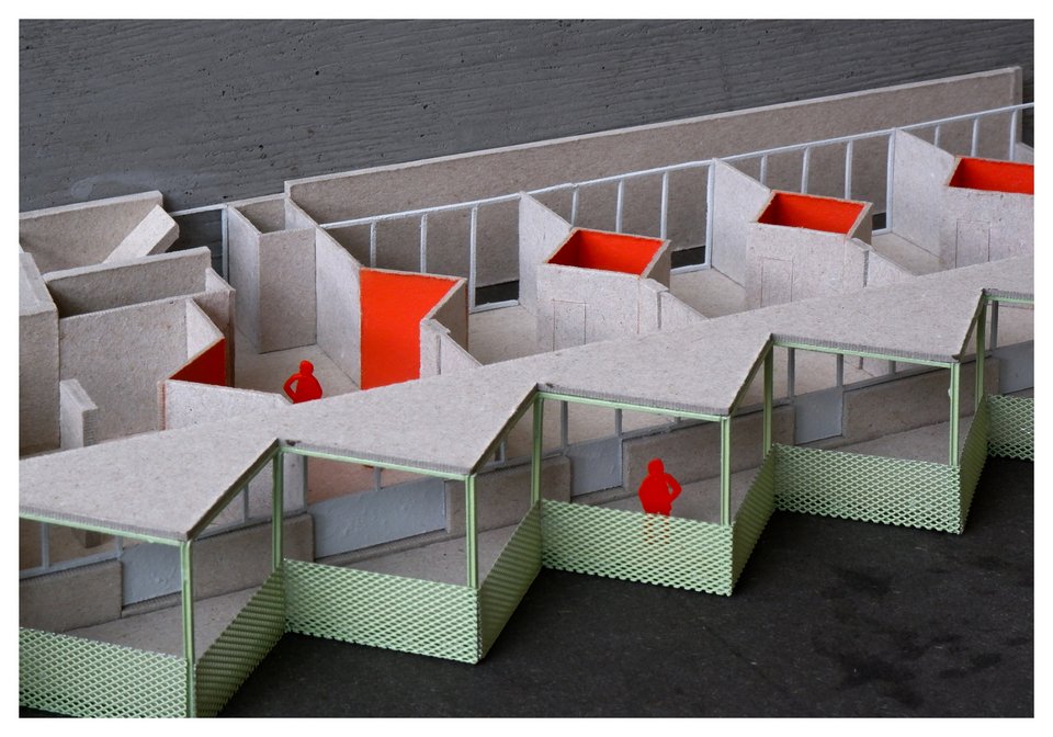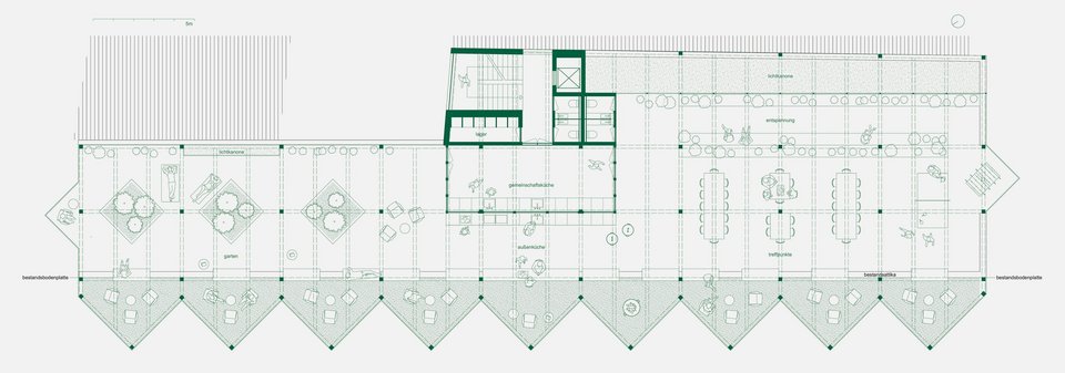 “Ecken und Kanten” fördert Gemeinschaft, gewährleistet gleichzeitig private Rückzugsorte, die Raum für Individualität und persönliche Entfaltung bieten. Eine klare Zonierung zwischen öffentlichen, privaten und gemeinschaftsfördernden Bereichen ist dabei von entscheidender Bedeutung, um eine harmonische Atmosphäre im Haus zu schaffen. Im Zentrum des Gebäudes befinden sich gemeinschaftsfördernde Bereiche, in denen Aktivitäten wie gemeinsames Waschen, Kochen und Gemütliches Beisammensein stattfinden können. Durch Erker in den Laubengängen entstehen zudem Begegnungsorte, die den Bewohner*innen zusätzliche Möglichkeiten bieten, miteinander in Kontakt zu treten und sich auszutauschen. Im Dachgeschoss erwartet die Bewohner*innen eine grüne Oase, in der sie Licht, Luft und Sonne unter der Pergola des Gerüsts genießen können. Der Erdgeschossbereich wird zu einem Raum für Treffpunkte. Hier entsteht ein Gemeinschaftsprojekt, das der Öffentlichkeit zugänglich ist und durch Kreativräume und kleine Ausstellungsorte belebt wird.