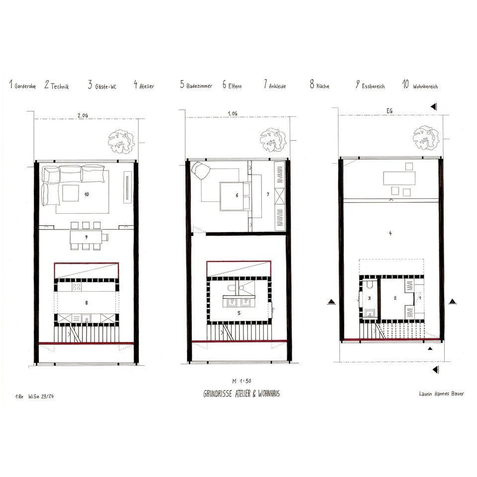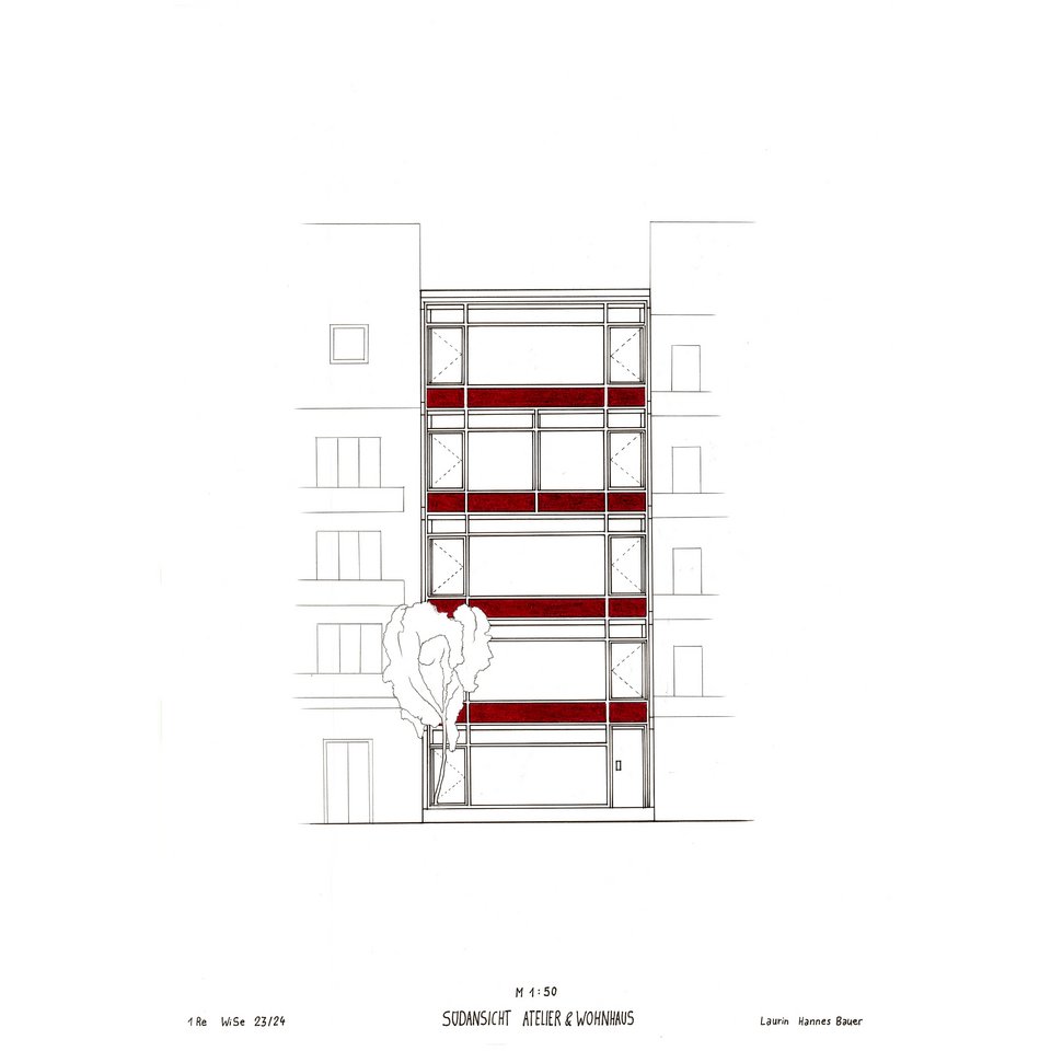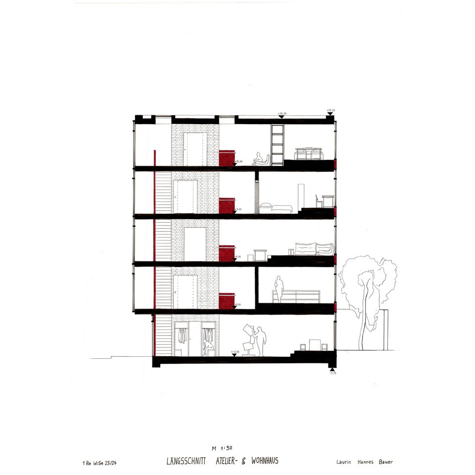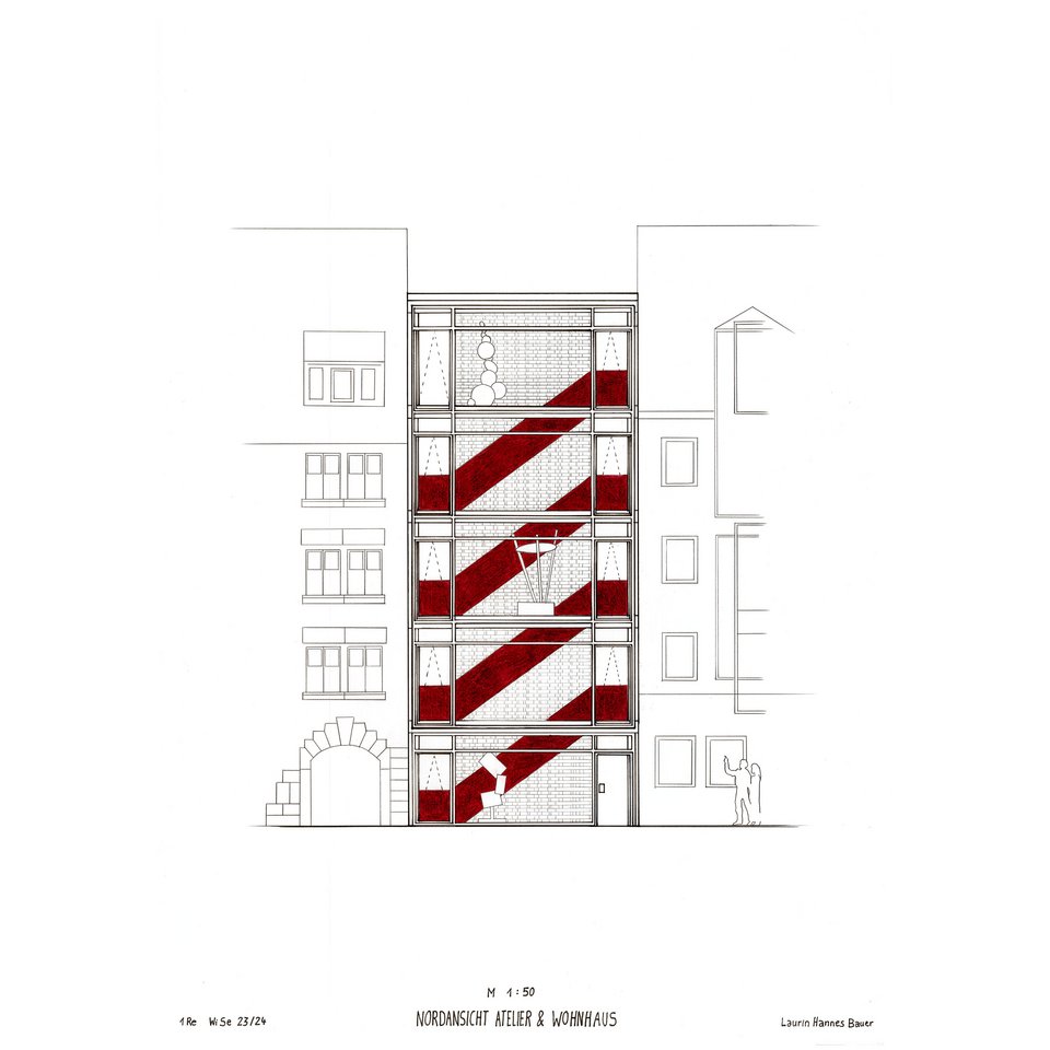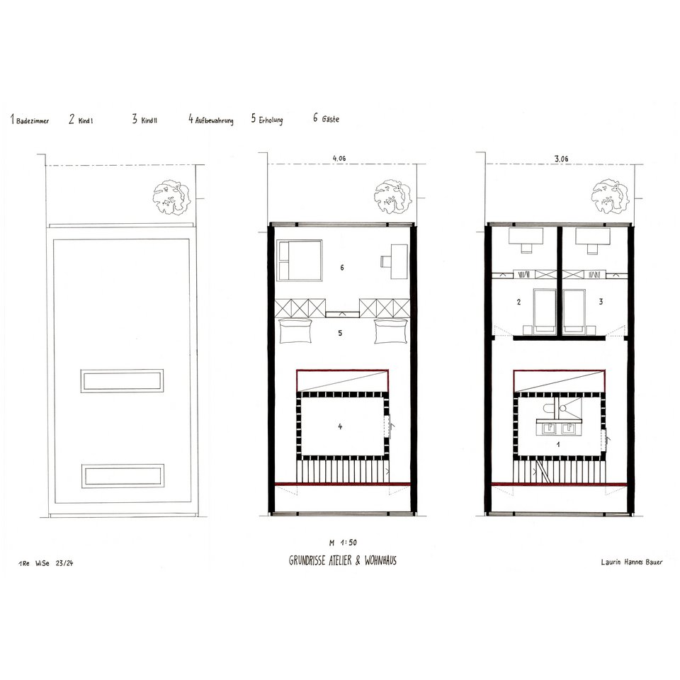 Bei unserer ersten Semesterarbeit im Fach Raumentwurf ging es um das Thema der Schließung einer bestehenden Baulücke im Stadtzentrum von Stuttgart. Die relativ schmale und nicht besonders tiefe Fläche sollte ohne Keller und mit nicht mehr als fünf Geschossen bebaut werden. In meinem Entwurf war mir wichtig, dass Funktion und Gestaltung so miteinander verknüpft sind, dass das Leben und Arbeiten der vierköpfigen Familie ohne große Einschränkungen möglich ist. Mein Entwurf „Atelier- und Wohnhaus“ ist geprägt durch einen „Glaskörper“, der zugleich die Nordfassade des Hauses bildet, welcher zum Einen für so viel Lichteinfall wie möglich von der Nordseite dient und zum Anderen als Fläche zur Ausstellung der geschaffenen Kunstwerke fungiert.