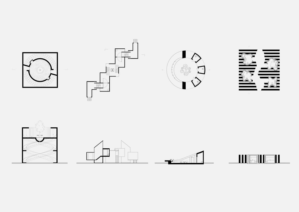 Ausgewählte Arbeiten (Grundriss / Schnitt und Modellfotos v.l.n.r.): Kimberley Rahn & Eleni Saure, Babette Frank & Luisa Breuninger, Emma Prager, Lea Brodbeck & Lia Schmidt, Selina Bassi & Zoey Stahlfeld, Virginia Dauber & Yasmin Klingler, Nehir Ercan & Annacarla Infante, Edith Single & Romy Stellmacher, Lena Becher & Sara Nebe