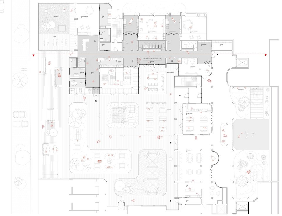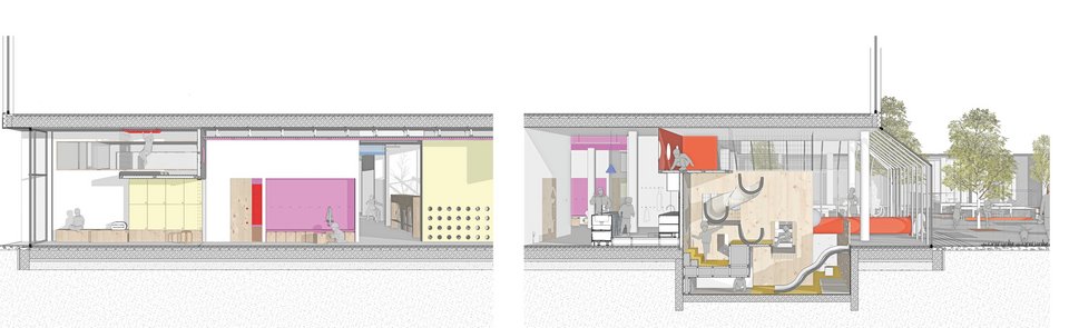 Die fließende Raumaufteilung im Kindergartenentwurf spiegelt die spielerische Energie und Unbeschwertheit der Kinder wieder. Der Spielflur dient nicht nur als Raum für gemeinsame Aktivitäten, sondern beherbergt auch die Küche, Waschbecken und den Zugang zum Gartenbereich. Kleine Nebenräume sind durch Nischen von den großen Gruppenräumen für die verschiedenen Kindergruppen abgetrennt.