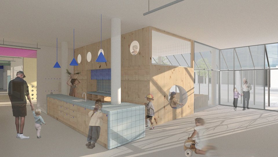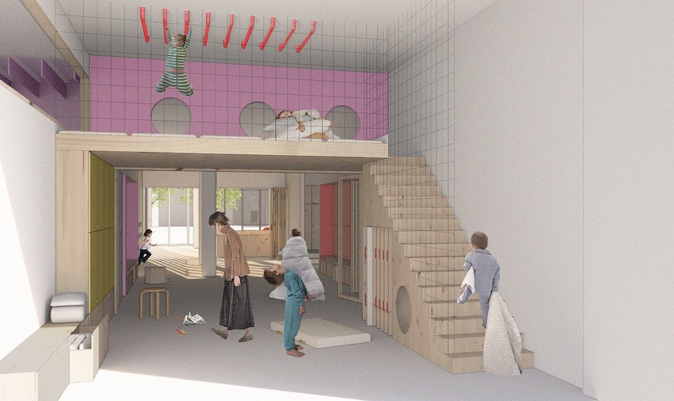Der Entwurf des integrierten Kindergartens im Seniorenheim St. Monika hat das Ziel, die Leichtigkeit und Unvoreingenommenheit von Kindern in das bestehende Wohnheim zurückzubringen, um die Bewohner*innen aus ihren Zimmern zu locken, sodass sie wieder am gemeinsamen Leben teilnehmen. Das Wohnheim für Senioren liegt mitten in Neugereut, an einem belebten Marktplatz, doch im Gebäude herrscht eine bedrückende Stille, die ältere Menschen sozial und räumlich von der Gesellschaft abtrennt. Der Kindergarten im Sockelgeschoss des Bestandsgebäudes wird durch einen neuen Zugang und generationsübergreifende Begegnungsräume wie eine gemeinsame Küche, ein Restaurant und einen Garten zu einem neuen Mittelpunkt des Wohnheims.