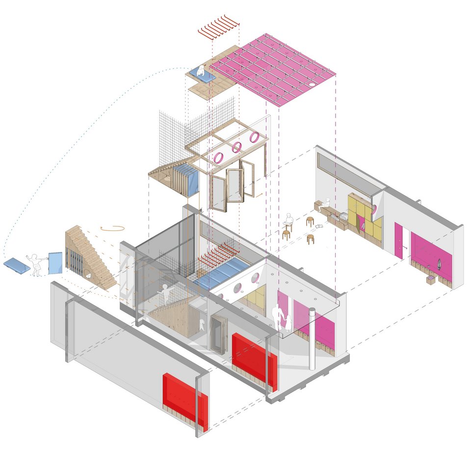 Der ehemalige Therapiebereich wurde zu einem großen Toberaum umgestaltet, da das verglaste Schwimmbecken nicht mehr genutzt wird. Hier entsteht durch unterschiedliche Höhen und spielerische, kletternde Elemente ein kreatives Chaos für die Kinder. Ein verspieltes, aber dennoch klares Farbkonzept sorgt für eine klare Aufteilung der einzelnen Gruppen und Räume. Jedes Kind hat dabei seinen eigenen Platz, der durch das Farbkonzept und die Gestaltung des Raums definiert wird.