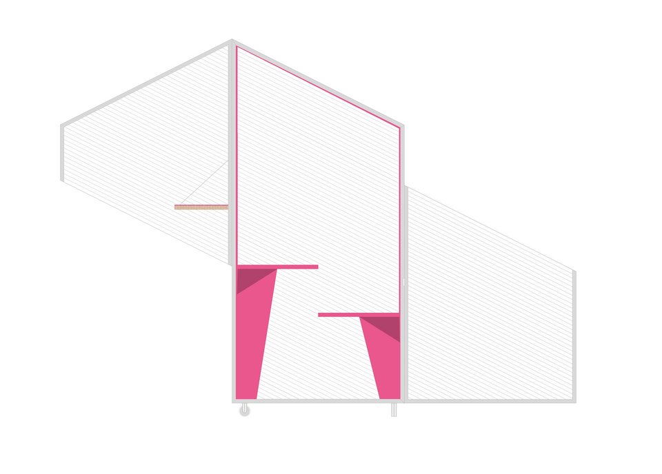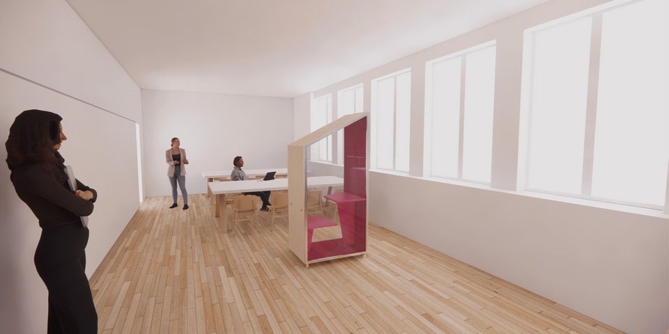 In unseren Arbeitsräumen herrscht teilweise ein sehr hoher Geräuschpegel und das Arbeiten ist nur an großen Gruppentischen möglich. Unser Ziel war deshalb eine Einzelarbeitskabine zu entwerfen, die einem die Möglichkeit gibt, etwas abgeschotteter und fokussierter zu arbeiten. Die Türen des StudioPods lassen sich dabei in verschiedenen Variationen öffnen und schließen, um anderen signalisieren zu können, ob man kommunizieren möchte oder nicht. Der ausklappbare Tisch bietet zudem die Möglichkeit für einen zweiten Arbeitsplatz, an dem im Stehen gearbeitet werden kann. Dies bietet eine willkommene Abwechslung zum stundenlangen Sitzen.