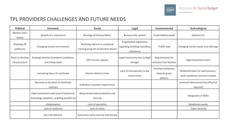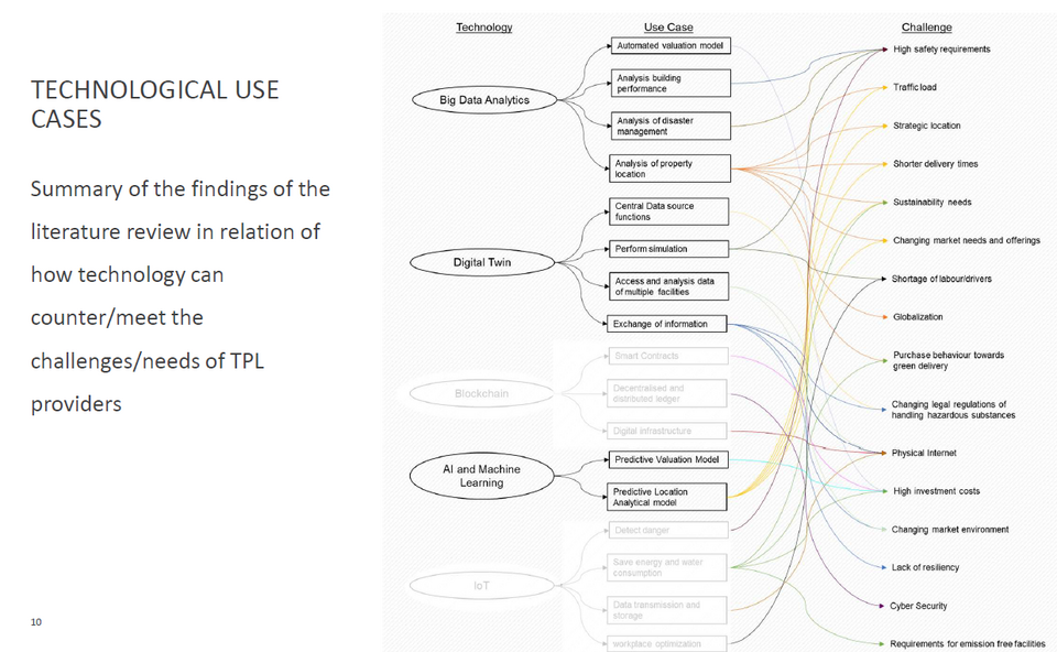 A growing number of companies are resorting to third-party logistics (TPL) providers to achieve customer satisfaction and survive in a tough competitive market. However, TPL providers are struggling to fulfil their requirements. They need to redefine their business models and find new solutions to increase their competitive advantage. Logistics real estate (LRE) can support TPL providers by increasing the value of the logistical properties. LRE can invest in equipping the logistical properties with technologies such as digital twin for the warehouse to help TPL providers be flexible in the redesigning the warehouse or performing traffic simulation to improve their operations. This study aimed to help LRE decide which technology to invest in by identifying the most prominent technologies for the TPL providers. It explored the challenges and future needs that TPL providers in Germany face and investigated which technologies can counter these challenges or satisfy the needs. The study introduced a tool to assess and compare different technologies in relation to their usefulness to the TPL providers. The study also extended its focus to capture the user of the logistical property acceptance of the technologies. This should help TPL providers understand how the users of the logistical properties perceive different technologies and how the TPL providers influence their perception. A hybrid technology acceptance model, which combined innovation diffusion theory, technology acceptance model and two more variables, was designed to capture the user’s behavioural intention to use technologies.
