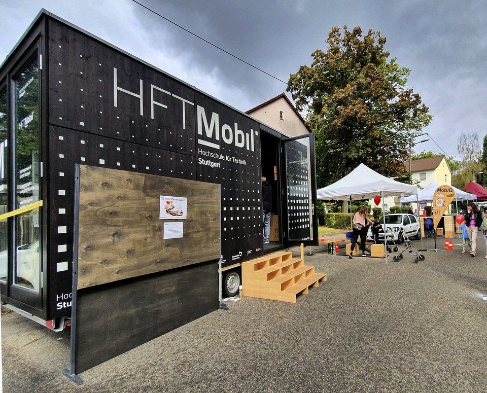 Einen Blickfang stellte das HFTMobil dar, das unter der Federführung des Studiengangs Innenarchitektur entstanden ist und zum Kreativraum-Projekt des M4_LAB gehört. Für die Veranstaltung „110 Meter Fleiner Zukunft“ wurde die mobile Holzkonstruktion nach Stuttgart-Rot transportiert. Im Innenraum konnten Besucher:innen eine Ausstellung bisheriger MobiQ-Ergebnisse besichtigen.