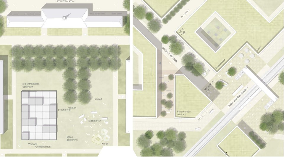 Die konzeptionelle Gestaltungsidee des Entwurfs ist die Freiraumvernetzung innerhalb und außerhalb des Projektgebiets. Das entstehende
