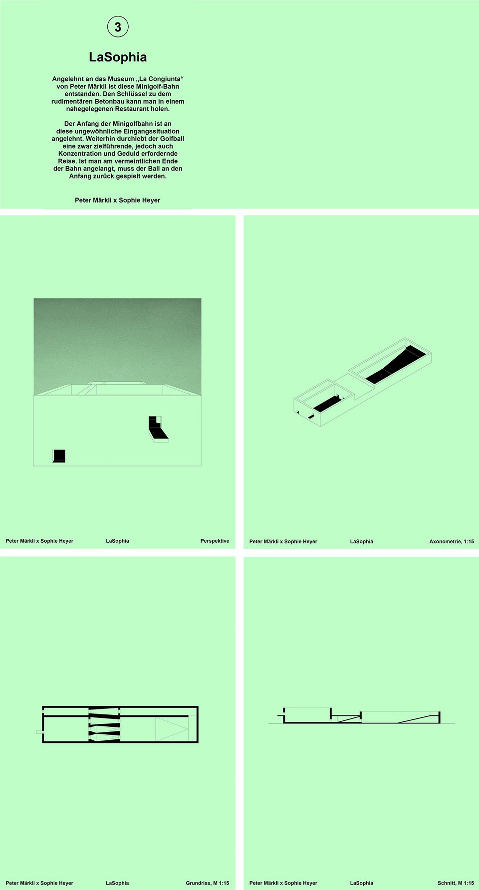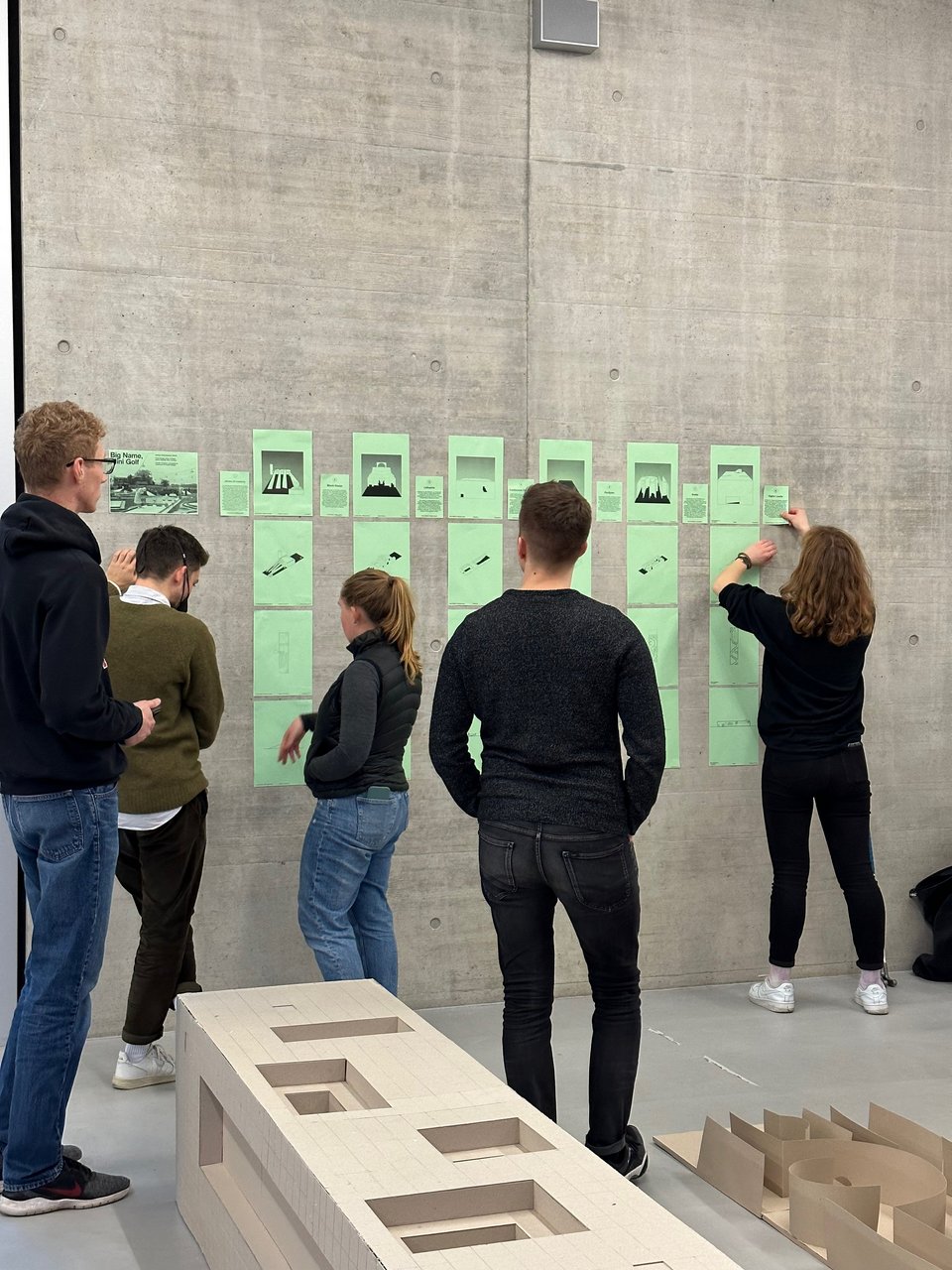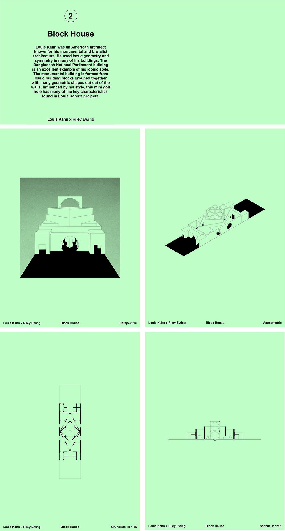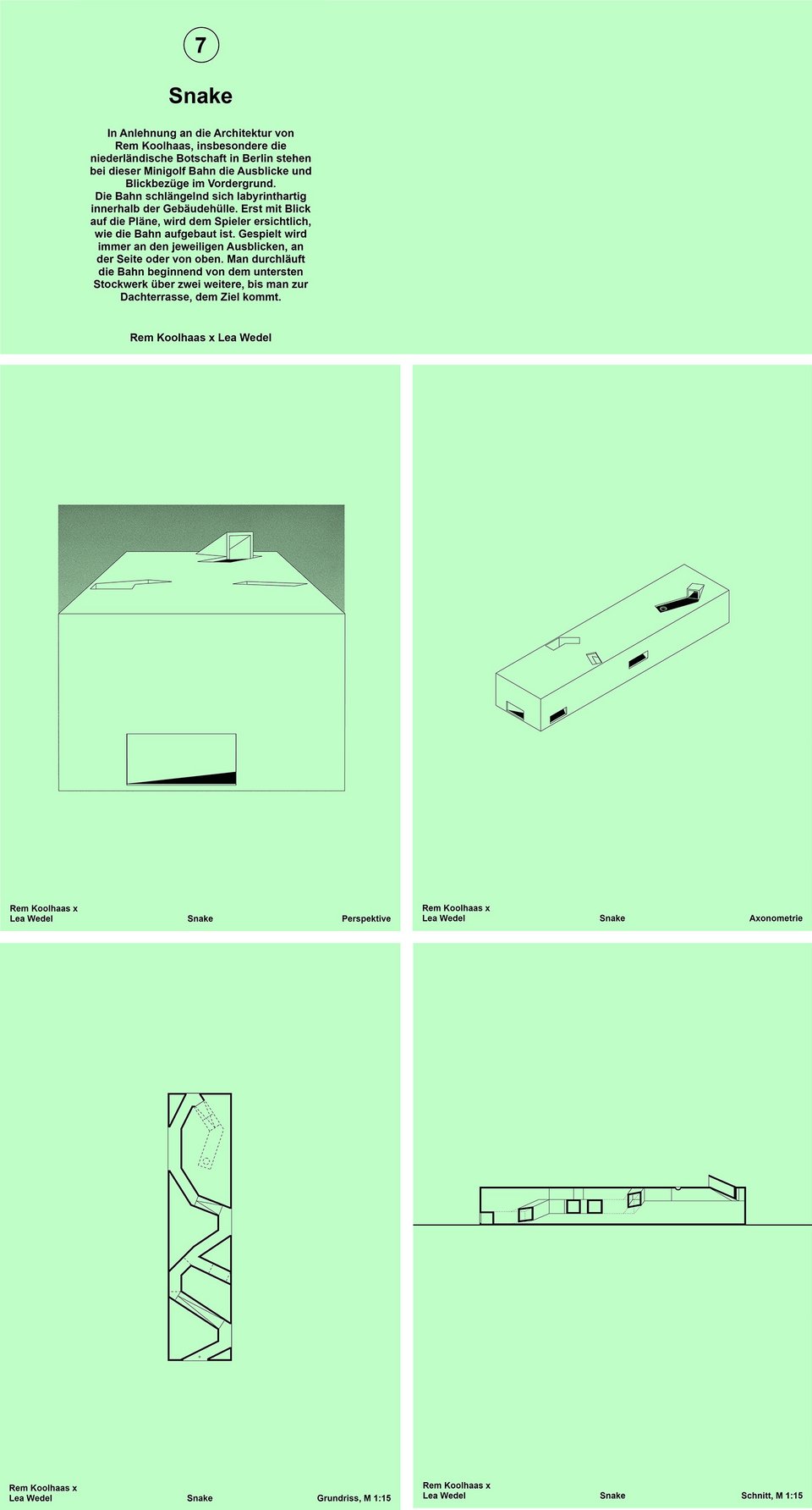 Das Seminar verstand sich als Experimentierraum, in dem – aufbauend auf einem eigenen kleinen Entwurf – Darstellungsmethoden im Rahmen von vier kompakten Workshops getestet und gemeinsam diskutiert wurden. Als Startpunkt des Seminars diente die Auseinandersetzung mit einem Big Name, d.h. einer großen Persönlichkeit der Architektur. Deren Entwurfsmethodik wurde analysiert, festgehalten und übertragbar gemacht. Als Projektionsfläche diente dann im nächsten Schritt ein neu zu entwickelndes Hindernis einer Mini Golf-Bahn, das ganz im Sinne der Methodik des Big Name auszugestalten war. Kern des Seminars war die spielerische Schärfung folgender Kompetenzbereiche: Narration und Konzeptentwicklung, Zeichenkonventionen und Plangrafik, Collage und perspektivische Darstellung, Modellbau und Präsentation.