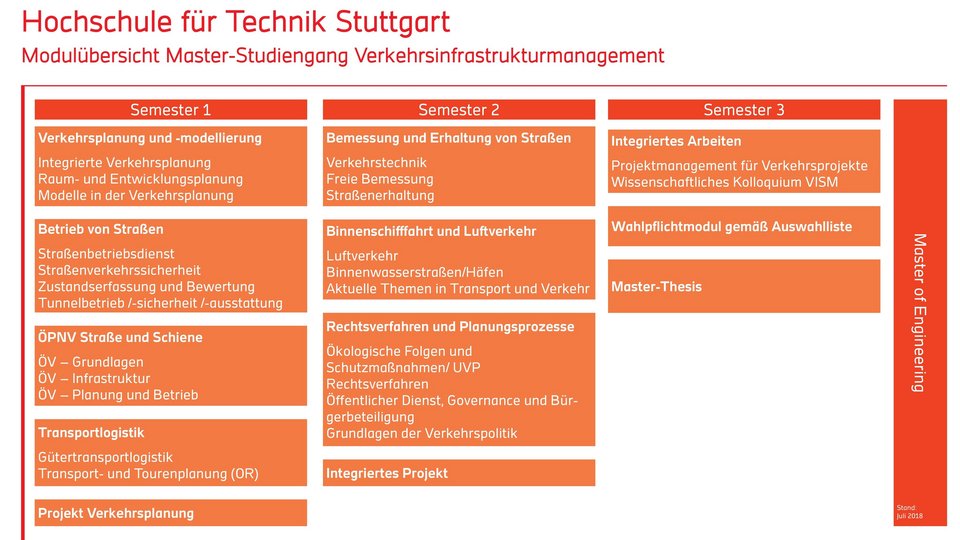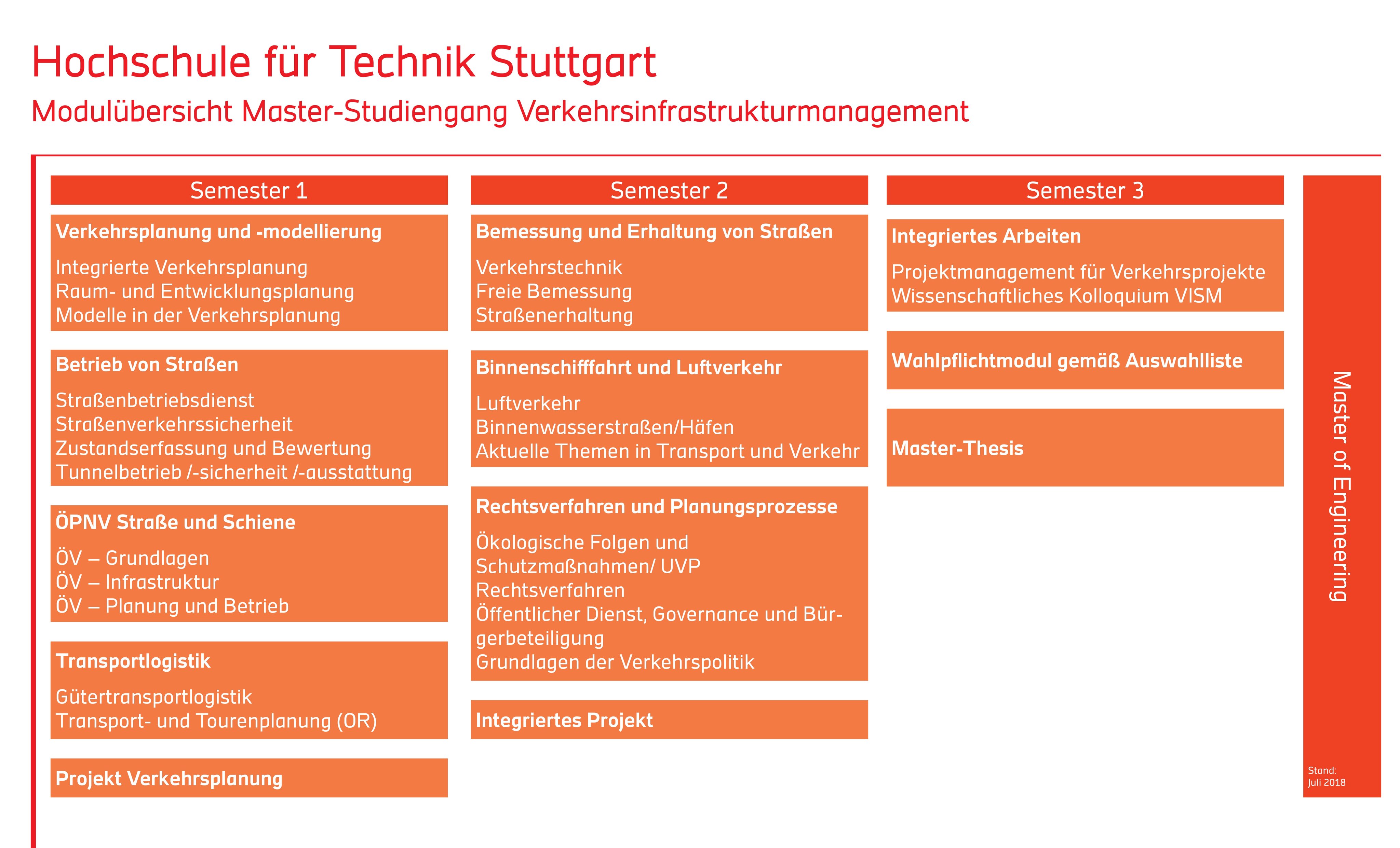 - Um an der Hochschule für Technik den Masterstudiengang Verkehrsinfrastrukturmanagement studieren zu können, benötigen Sie einen ersten erfolgreichen, berufsqualifizierenden Hochschulabschluss mit mindestens sechs Studiensemestern an einer deutschen Hochschule oder einer vergleichbaren ausländischen Hochschule in einer Studienrichtung mit raum- oder verkehrsbezogenen Schwerpunkten.