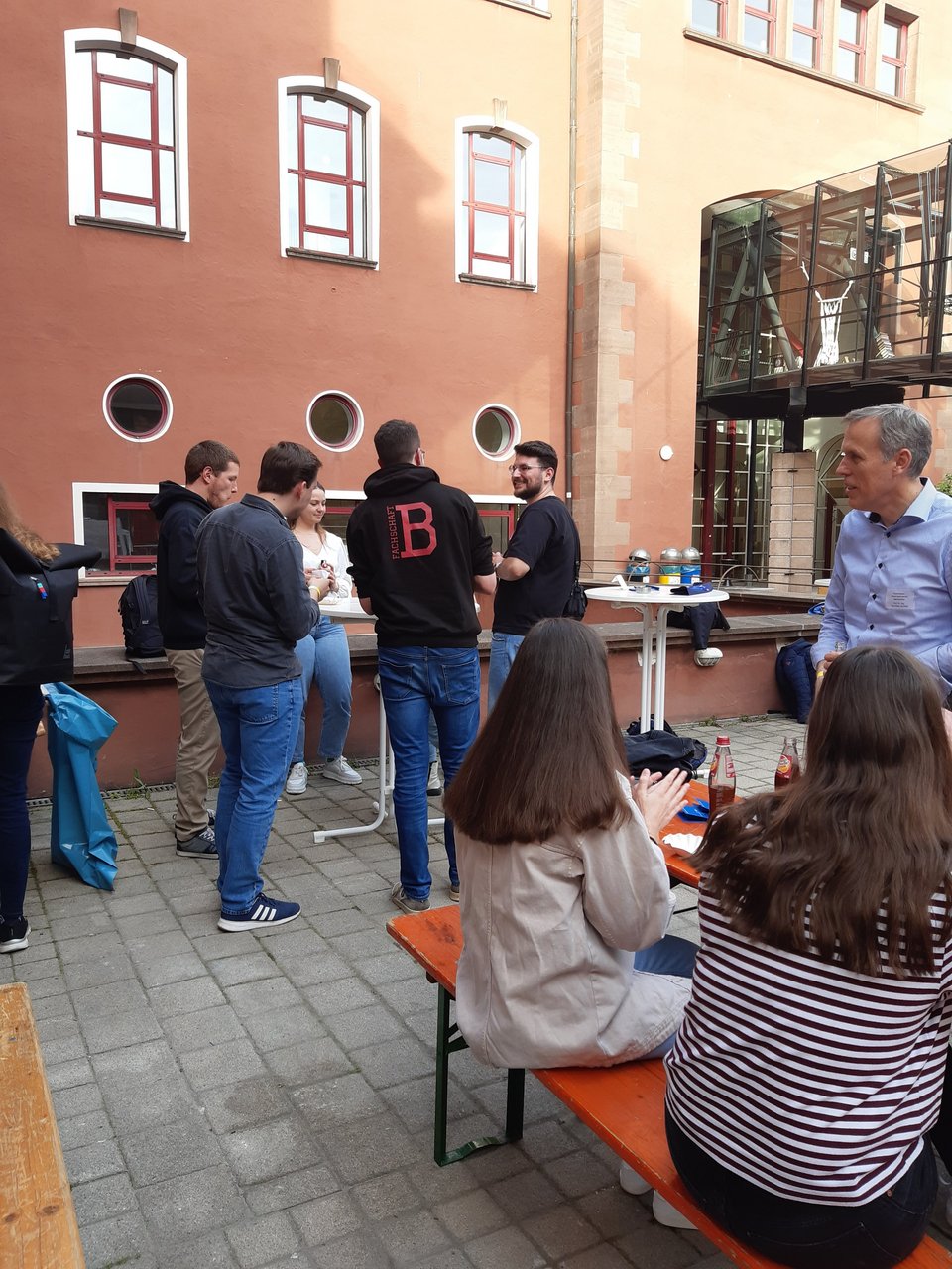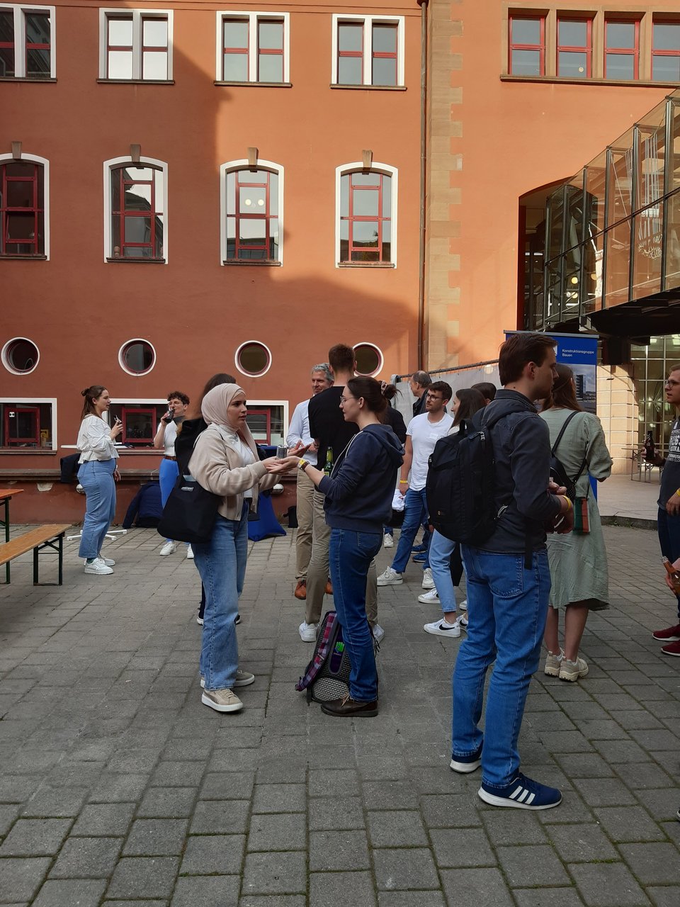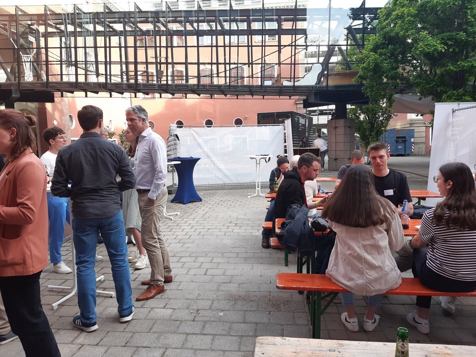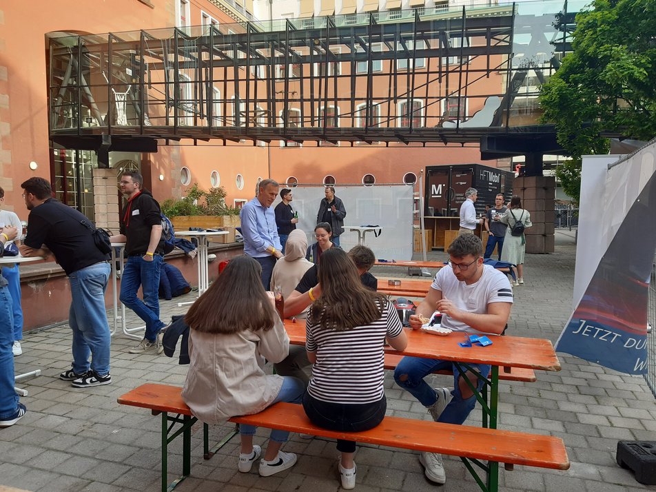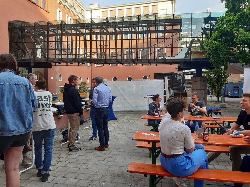 In ausgelassener Runde versammelten sich die Studierenden, einige Lehrende sowie Mitglieder des Unternehmerbeirats nach dem Vortrag mit den Unternehmensvertreter:innen der Konstruktionsgruppe Bauen beim BlockVier e.V. im Innenhof der HFT Stuttgart. Bei kühlen Getränken und einer roten Wurst bzw. Grillkäse, freundlicherweise von der Konstruktionsgruppe Bauen spendiert, konnten die Studierenden zwanglos Kontakte knüpfen, sich rege austauschen und sich ganz nebenbei über Tätigkeiten und Praktika sowie Abschlussarbeiten im Unternehmen informieren.