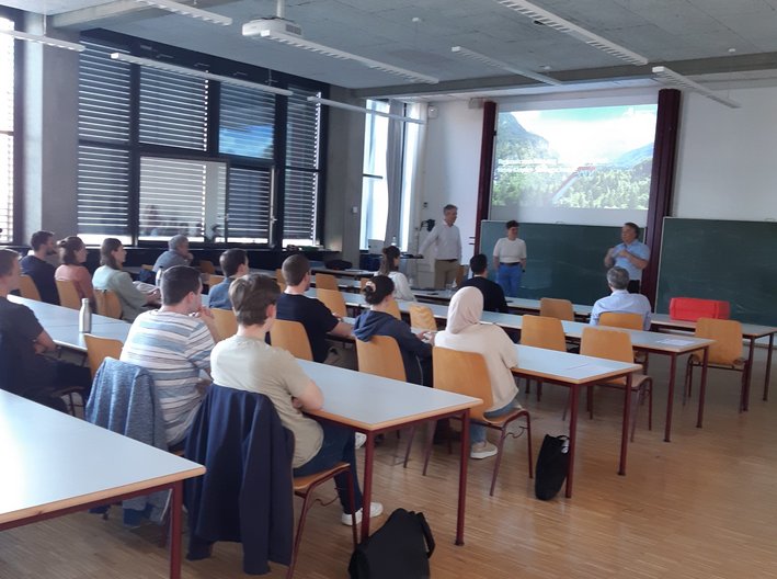 Johanna Höb und Andreas Möller zeigten den Studierenden auf, wie die Generalsanierung dieses filigranen Bauwerks umgesetzt wurde. Möller erklärte, dass nur durch eine detaillierte 3D-Nachrechnung und mit dem Einsatz innovativer Technologien der markante Kragarm - eine ingenieur- und bautechnische Meisterleistung- erhalten und den aktuellen Anforderungen angepasst werden konnte. Durch die Erhaltung des Kragarms, der im Fels verankert ist, konnten Ressourcen gespart und ein aufwendiger Neubau vermieden werden. Während des Vortrags reichten die Referent:innen zur Veranschaulichung Bohrkerne und Spannstähle des Bestandsbauwerks an die Teilnehmenden weiter.