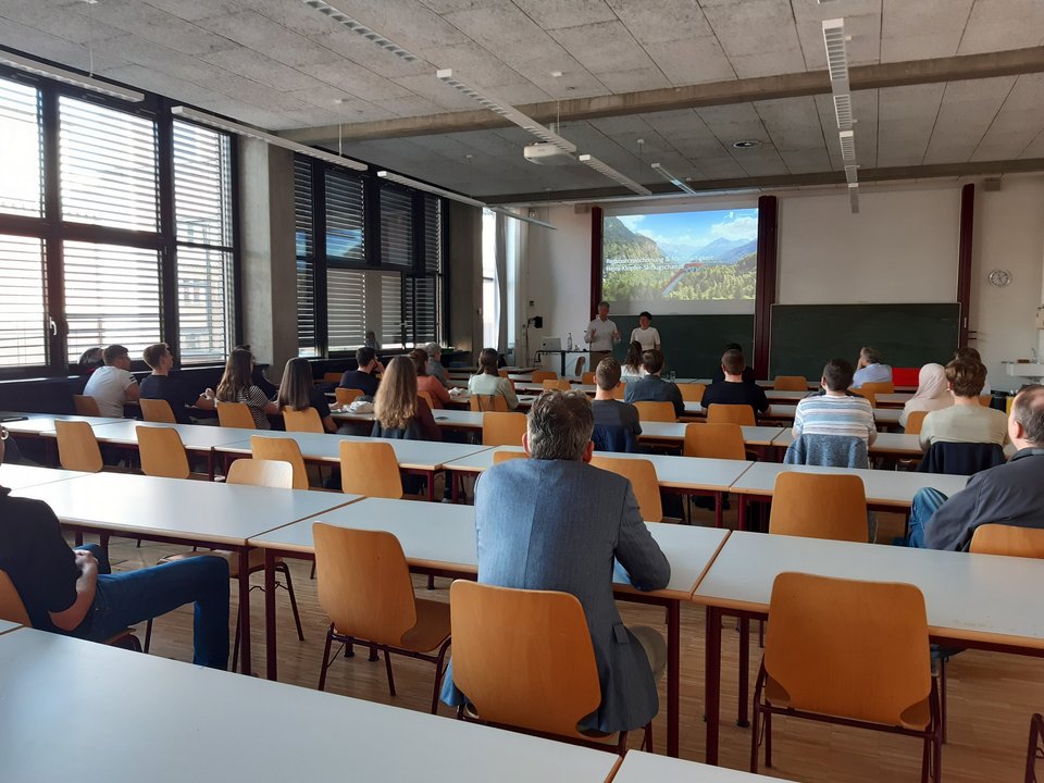 Zahlreiche Bachelor- und Master- Studierende des Studienbereichs Bauingenieurwesen und Bauphysik folgten der Einladung zum Vortrag „Ressourcenschonung & Nachhaltigkeit - Heini-Klopfer-Skiflugschanze“ der Konstruktionsgruppe Bauen AG am Donnerstag, 4. Mai 2023, im Rahmen der Vortragsreihe mit Praxispartnern des Unternehmerbeirats der Fakultät B.