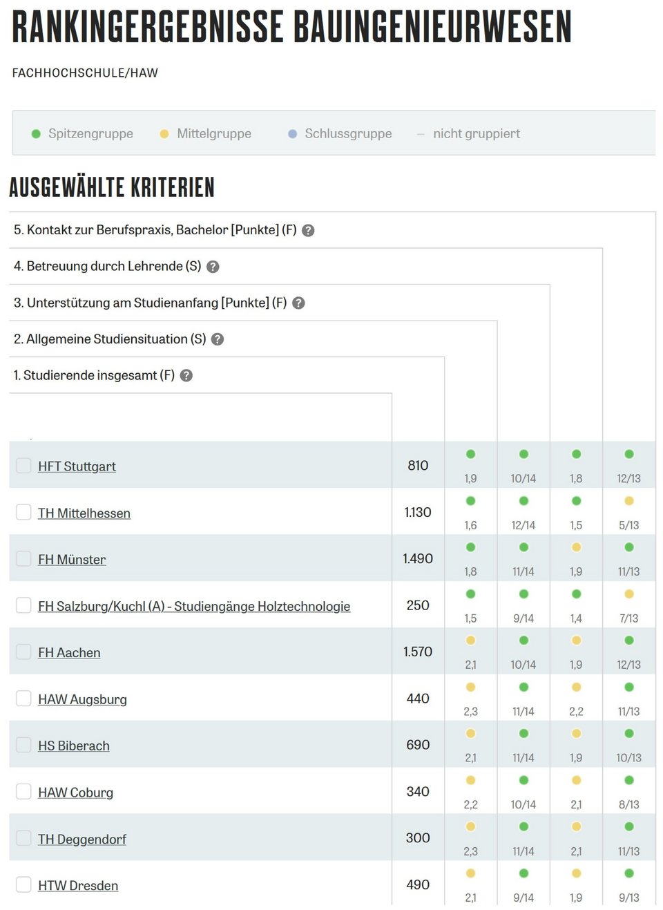Die Hochschule für Technik Stuttgart nimmt im aktuellen Ranking volle Fahrt auf und positioniert sich in zehn von 12 möglichen Kategorien in die Spitzengruppe und schneidet damit im bundesweiten Durchschnittsvergleich aller bewerteten Hochschulen im Bachelor Bauingenieurwesen und Bachelor Infrastrukturmanagement am besten ab!