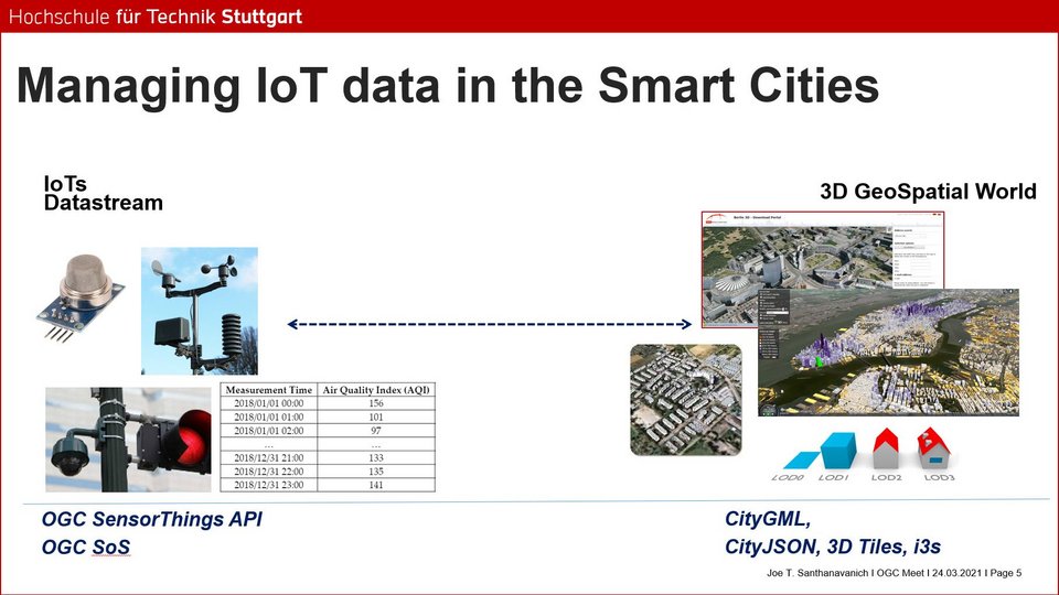 Internet-of-Things(IoT-)Daten sind auch relevant für städtische Infrastrukturen und Kontrollsysteme. Ein Beispiel, wie Daten sinnvoll miteinander verknüpft werden könnten, ist ein Feuer-Detektor. Dieser ist in der Lage, die Feuerquelle über einen IoT-Sensor im Gebäude zu lokalisieren. Diese Daten könnten kombiniert werden mit Daten im CityGML-Modell – wie zum Beispiel zum Gebäudematerial und Materialen des Flurs. Hinzu kommen weitere Daten über die Anzahl der Personen im Gebäude, die wiederum von einem anderen Sensor oder einem IoT-System generiert werden. Der Effekt: Die Feuerwehr verfügt bereits kurz nach dem Alarm über Informationen, die Leben retten können.