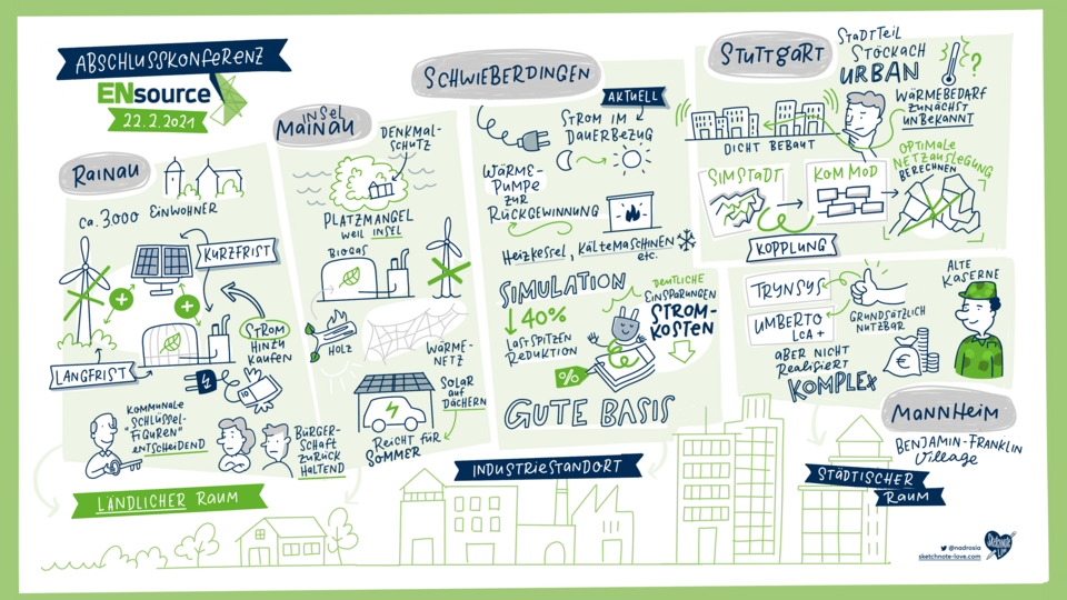 Durch die Zusammenarbeit konnte eine Vielfalt von digitalen Tools entwickelt werden. Wie sie kombiniert und weitreichend eingesetzt werden können, präsentierten die ENsource-Forscher*innen aus den Bereichen Ingenieurwesen, Informatik, Stadtplanung, Architektur und Forst- und Agrarwirtschaft anhand ihrer Fallstudien: im ländlichen Raum (Fallstudien Mainau und Rainau) und in städtischen Gebieten (Fallstudien Stuttgart und Mannheim). Auch an einem Industriestandort wurden die Werkzeuge getestet – in Schwieberdingen (Bosch). Die Tools sollen nun Energiemanager*innn, Planer*innen und Umweltingenieur*innen bei Entscheidungen dienen, wie sie ihre Energiesysteme in den Quartieren vorausschauend planen können. Dabei geht es um computergestützte Modellierung, Simulation und Optimierung.