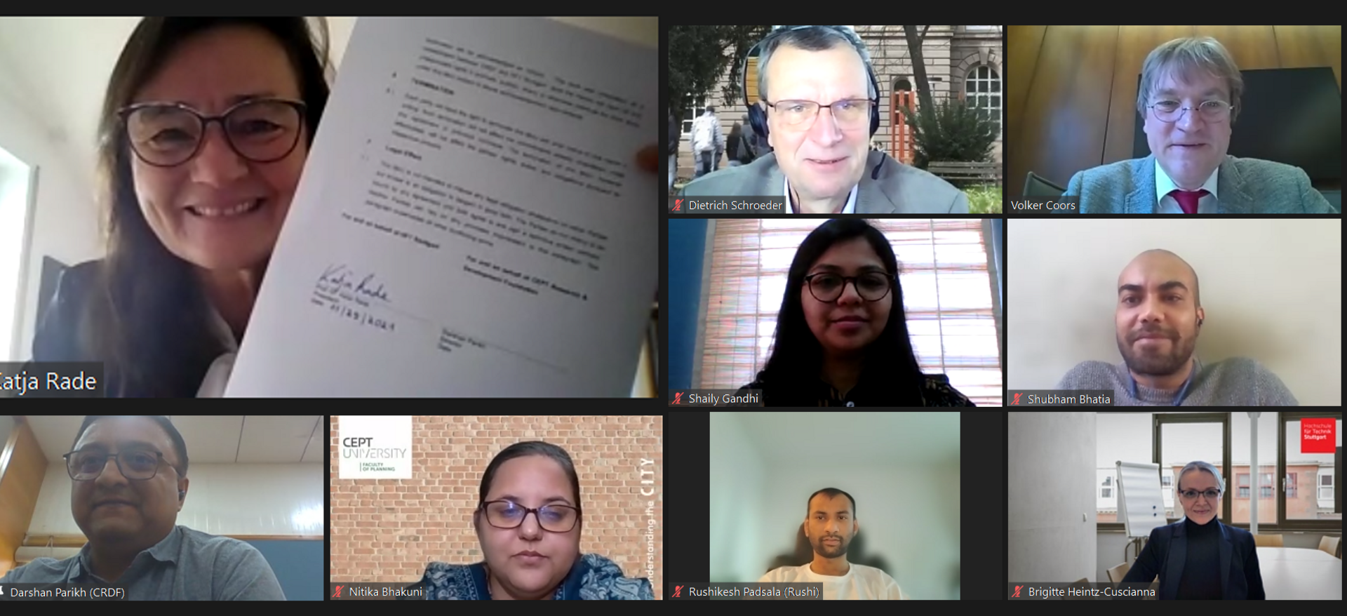 Die Delegation anlässlich der Unterzeichnung der Grundsatzvereinbarung bestand neben Prof. Dr. Katja Rade, Prof. Dr. Volker Coors und Darshan Parikh aus Prof. Dr. Dietrich Schröder (Prodekan, Fachgebiet Geoinformatik, HFT Stuttgart), Brigitte Heintz-Cuscianna (Leitung Akademisches Auslandsamt, HFT Stuttgart), Rushikesh Padsala (Akademischer Mitarbeiter Geoinformatik, HFT Stuttgart, ehemaliger Absolvent CEPT Universität), Dr. Nitika Bhakuni (geschäftsführende Executivdirektorin des Center for Applied Geomatics (CAG), Dr. Shaily Gandhi (CRDF Manager Informatics), Shubham Bhatia (Kommunikationsmanager, CRDF).