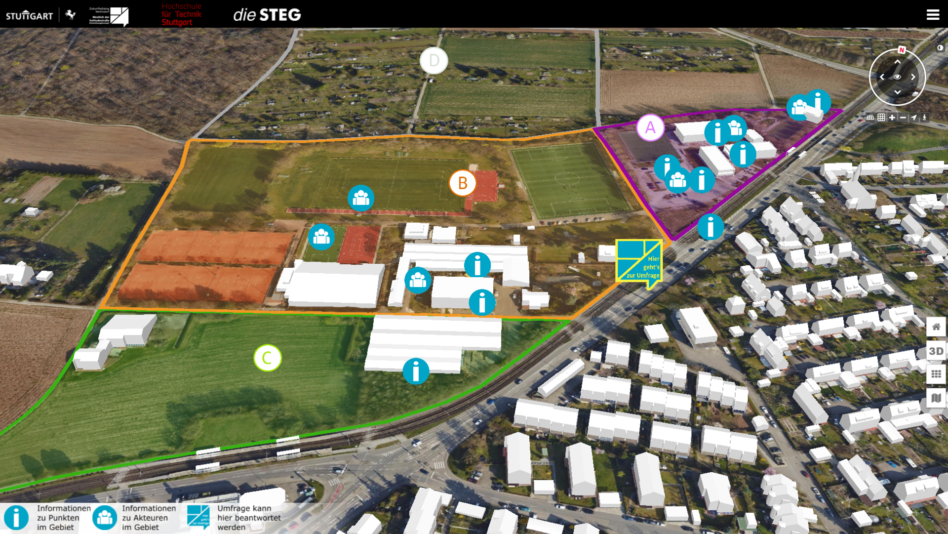 Auf der 3D-Beteiligungsplattform können sich die Weilimdorfer im Planungsgebiet durch verschieden Bereiche A, B, C und D zu den markierten Punkten navigieren, wo neue Projekte entstehen sollen. Im Bereich des Areals A der interaktiven 3D-Karte werden die Bürgerinnen über bestehende Ideen informiert, zum Beispiel ein Bürgerhaus zu realisieren für die Vereins- und Kulturarbeit. Das Gebiet B ist durch eine sportbezogene Nutzung geprägt. Hier gibt es bereits Sportplätze, Leichtathletikflächen oder Tennisplätze, für die eine Weiterentwicklung vorgesehen sind. Gebiet C, wo früher eine Gärtnerei angesiedelt war, besitzt vor allem grüne Freiflächen. Dort betreibt momentan ein Verein ein „Urban Gardening“ als temporäres, zeitlich-befristetes Projekt.