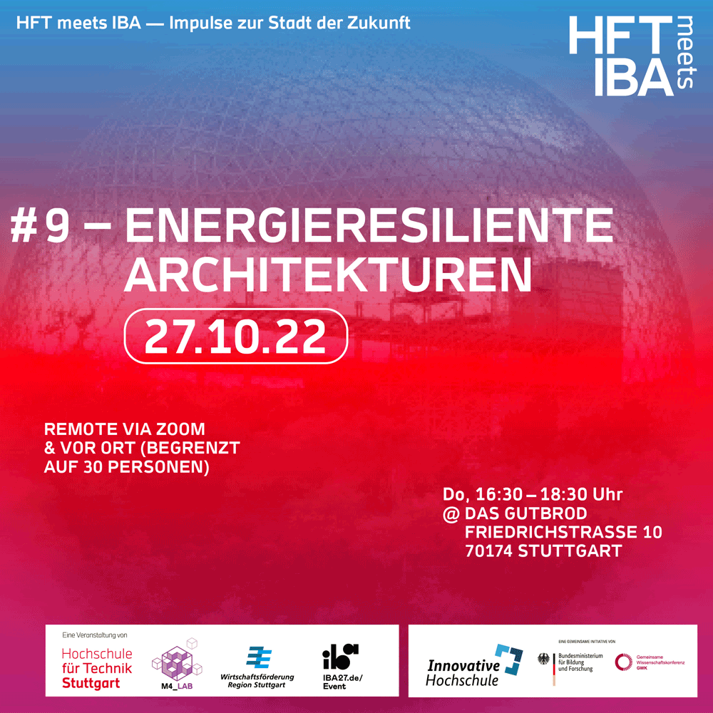 Wie unsere zukünftige Energieversorgung klimaneutral und sicher gestaltet werden kann, möchten wir mit Ihnen im Rahmen unserer Veranstaltung #9 "Energieresiliente Architekturen" am 27.10.2022, 16:30 bis 18:00 Uhr (Gutbrod, Friedrichstraße 10, 70174 Stuttgart) diskutieren. Die Veranstaltung ist Teil der Reihe "HFT meets IBA", welche von der Internationalen Bauausstellung 2027 StadtRegion Stuttgart, dem M4_Lab der Hochschule für Technik Stuttgart (HFT) und der Wirtschaftsförderung Region Stuttgart GmbH organisiert wird.