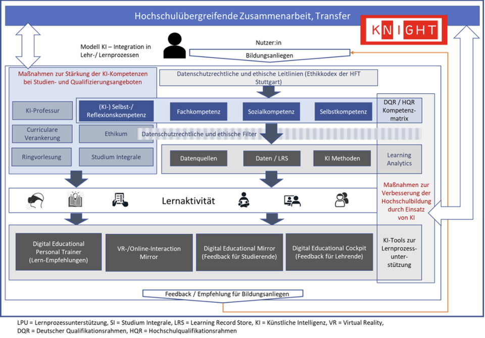 Die Hochschule für Technik Stuttgart hat sich zum Ziel gesetzt, eine führende Rolle zum Einsatz von KI in der Lehre einzunehmen. Dazu wird in dem Projekt KNIGHT ein vielschichtiges Modell umgesetzt, um unterschiedliche Nutzergruppen, Bedürfnisse und Aktivitäten miteinander in Einklang zu bringen. Folgende Bereiche sollen entwickelt werden: