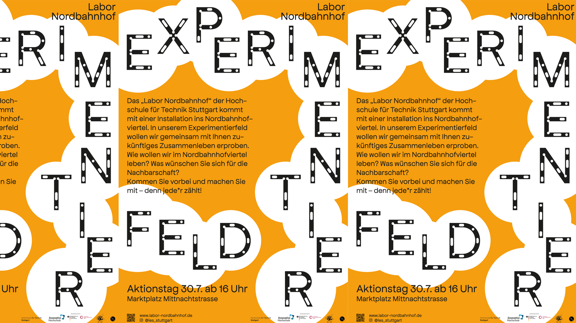 Das „Labor Nordbahnhof“, ein Projekt von Forschenden und Studierenden der Hochschule für Technik Stuttgart, lädt Anwohnerinnen und Anwohner sowie alle Interessierten zu einem Aktionstag ein. Er findet am Freitag, 30. Juli in der Mittnachtstraße (Marktplatz / Nähe Haltestelle Mittnachtstraße) ab 16 Uhr bis 19 Uhr statt. Hier entsteht eine Installation im öffentlichen Raum. Bürger:innen sind eingeladen, mitzumachen. Was genau entsteht, ist als Überraschung gedacht und gleichzeitig ein kreatives Experiment. Es geht um die Frage: „Wie wollen wir in Zukunft am Nordbahnhof leben?“ Das Projekt wird von der Bund-Länder-Initiative „Innovative Hochschule“ gefördert.