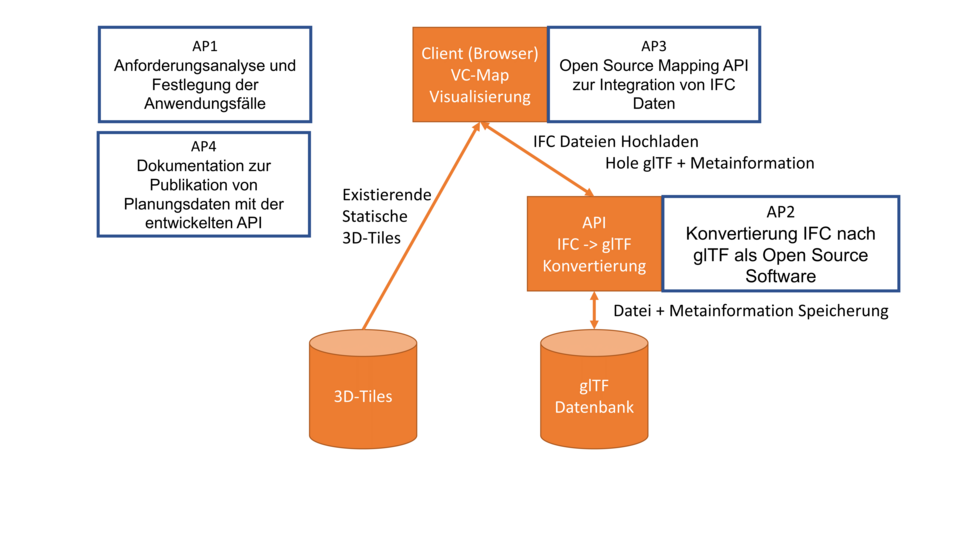 Es wird ein Konzept für die Integration von IFC Modellen in Urbane Digitale Zwillinge erarbeitet und anhand einer prototypischen Implementierung evaluiert. Dazu werden Methoden zur Datenkonvertierung und Modellvereinfachung untersucht und evaluiert. Das beinhaltet neben dem zu übertragenden Datenvolumen in einer Web-basierten 3D-Visualisierung auch das Erstellen von Bedienungselementen, die eine Georeferenzierung und örtliche Manipulation des konvertierten Modells ermöglichen.