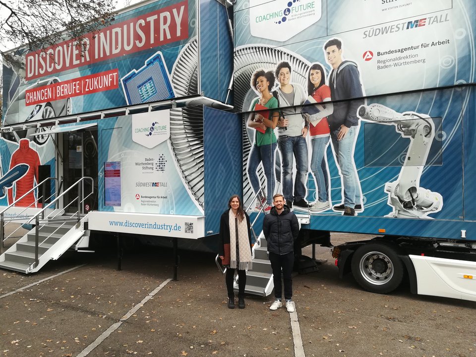Seit Herbst 2019 ist unsere Montageplanung Teil des Erlebnis-Lern-Trucks Discover Industry, der Schulen in Baden-Württemberg anfährt, um Schülerinnen und Schüler für den MINT-Bereich zu begeistern. Discover Industry ist Teil des Programms COACHING4FUTURE der Baden-Württemberg Stiftung gemeinsam mit dem Arbeitgeberverband SÜDWESTMETALL und in Kooperation mit der Regionaldirektion Baden-Württemberg der Bundesagentur für Arbeit. In dem zweistöckigen LKW wird an fünf Arbeitsstationen und mehreren Exponatwänden die Arbeitswelt von MINT-Berufen aufgezeigt. An der umgesetzten Exponatwand zum Thema digitale Assistenten lösen die Schülerinnen und Schüler ein Nagel-Puzzle im Wettlauf gegen den Computer.