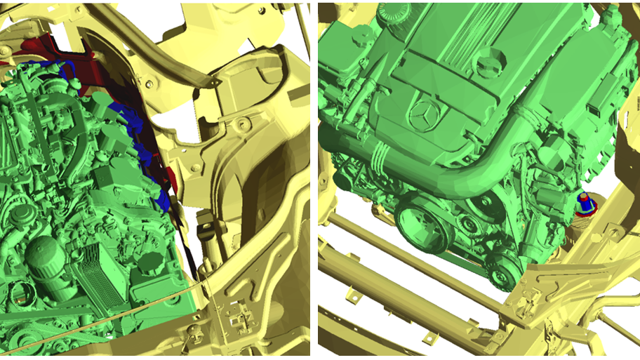 Ein wichtiger Aspekt im Digital MockUp ist zu überprüfen, dass die Bauteile keine Kollisionen untereinander aufweisen, d.h. nicht den gleichen Bauraum einnehmen. Die in der Praxis zuhauf auftretenden Kollisionen zwischen Bauteilen weisen den Ingenieurinnen und Ingenieuren in einigen Fällen relevante Fehler auf, die eine konstruktive Veränderung der Bauteile erfordern. Die Mehrzahl ist allerdings für die Ingenieurinnen und Ingenieure irrelevant. Ein häufiges Beispiel sind Kollisionen, an denen Schrauben, Bolzen oder Klipse beteiligt sind. Deren Aufgabe ist es, Bauteile aneinander zu befestigen, und die sich ergebenden Konflikte sind gewollt.