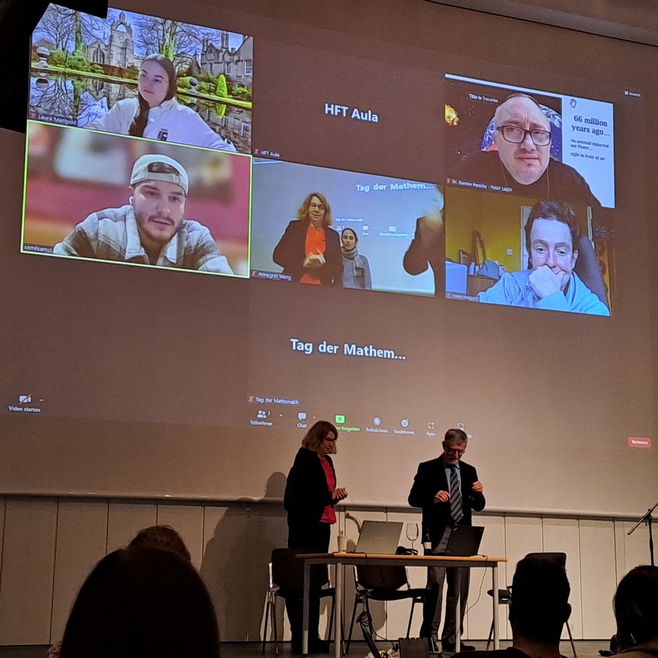 Nach einer kurzen Kaffeepause übernahmen Prof. Dr. Annegret Weng und Prof. Dr. Paul-Georg Becker das Podium und führten in einer Live-Schaltung unter dem Motto „Mathematik mal woanders“ interessante Interviews mit Professor:innen aus Dublin und Yucatán (Mexiko) und mit Studierenden im Auslandssemester in Aberdeen und Istanbul. Die lockere Gesprächsrunde wurde durch gemeinsames Anstoßen mit einem landestypischen Getränk abgerundet.