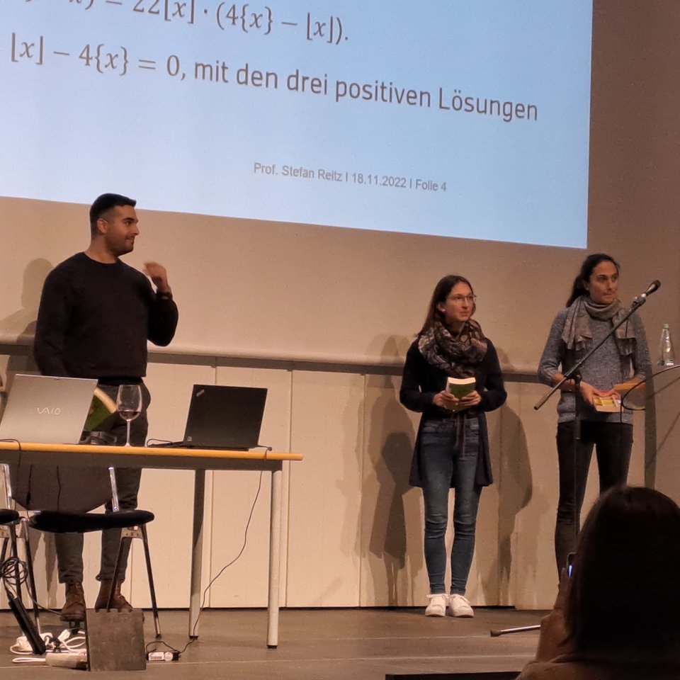 Die Auflösung der Preisaufgabe übernahm dann Prof. Dr. Reitz, der in Windeseile die Lösung der kniffligen Aufgabe vorführte und im Anschluss den drei Studierenden Herrn Theodoros Liakas, Frau Martina Rahija und Frau Vanessa Schmid einen Buchpreis für richtige Lösungen verlieh. Der Ausklang fand dieses Jahr wieder wie gewohnt mit anregenden Gesprächen und gemütlichem Beisammensein im Lichthof statt und bildete einen schönen Abschluss des Tags der Mathematik 2022.