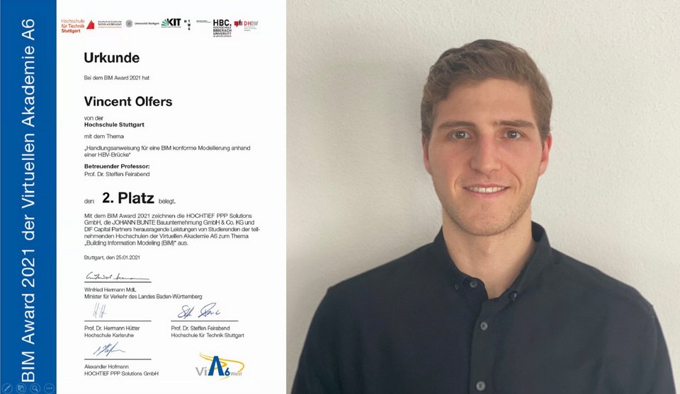 Vincent Olfers, Absolvent der HFT Stutttgart, hat mit seiner Bachelor-Arbeit im Studiengang Bauingenieurwesen den mit 3.000 Euro dotierten 2. Platz beim BIM-Award 2021 der Virtuellen Akademie A6 gewonnen. Insgesamt hatten 37 Studierende 15 Wettbewerbsbeiträge eingereicht, sechs von ihnen erhielten einen Preis. Landesverkehrsminister Winfried Hermann MdL hat die Preise am 25. Januar 2021 im Rahmen einer Online-Veranstaltung verliehen.