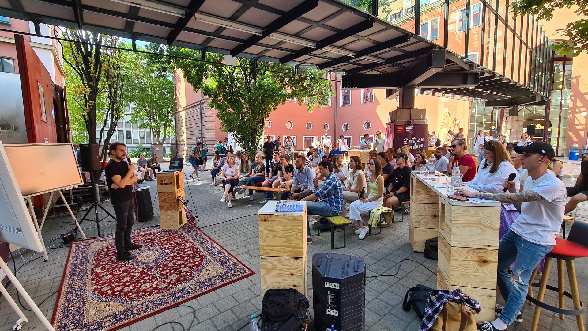 Im Anschluss an das Pitch-Event startete die große Open-Air-Party im Innenhof der HFT Stuttgart. Bis spät in die Nacht wurde über die Lösungen gefachsimpelt, neue Kontakte geknüpft und gefeiert.