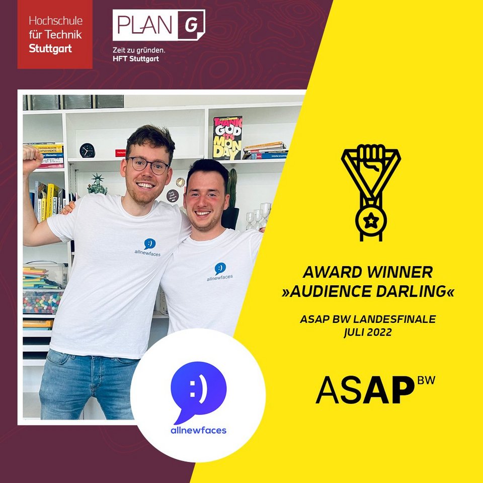 Halbjährlich treten beim Finale von ASAP BW die vielversprechendsten Hochschulstartups Baden-Württembergs des vergangenen Semesters an, um Jury und Zuschauer mit einem messerscharfen Pitch vom eigenen Geschäftsmodell zu überzeugen. Insgesamt nehmen über 100 Teams von 25 Universitäten und Hochschulen am Programm teil. 26 Teams konnten sich für das Finale qualifizieren. Darunter sensationelle acht Teams der Hochschule für Technik Stuttgart, die somit den weitaus größten Anteil an Finalist:innen stellte. Ein toller Erfolg für das hochschuleigene Gründungszentrum PLAN G aus dessen Gründungsformat STARTPLAN die meisten Teams hervorgegangen sind.