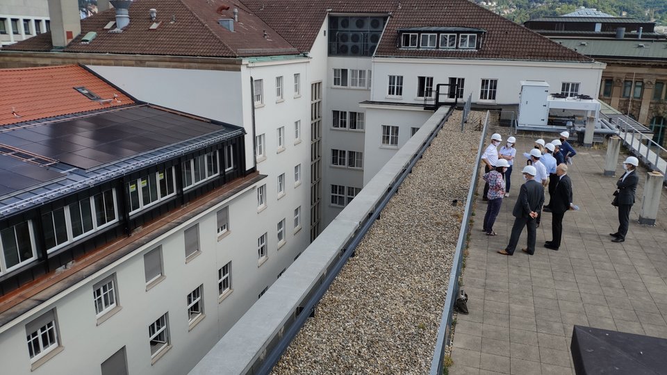 Staatssekretärin Splett und Amtschef Steinbach verschafften sich hoch über den Dächern von Stuttgart einen Eindruck über die moderne Kälteanlage der Hochschule für Technik Stuttgart.