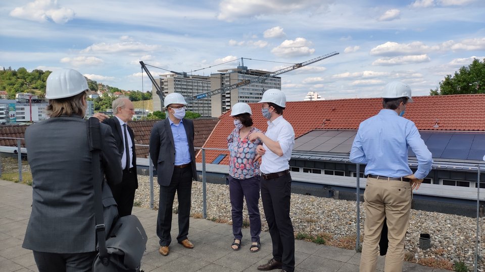 Prof. Rainer Franke, Rektor der HFT Stuttgart empfing gestern Finanzstaatssekretärin Gisela Splett und Ulrich Steinbach, Amtschef im Ministerium für Wissenschaft, Forschung und Kunst an der Hochschule. Im Fokus des Termins stand das Gemeinschaftsprojekt EnSign Reallabor zwischen der Hochschule für Technik Stuttgart, dem Universitätsbauamt Stuttgart und der Hochschule Hohenheim.