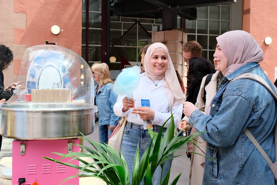 Der Geruch von himmelblauer Zuckerwatte, salzigem Popcorn, knusprigen Bratwürstchen und starkem Kaffee wehte über den Innenhof der HFT Stuttgart. Viele Menschen genossen den Sonnenschein, in allen Ecken Gespräche und Lachen. Fröhliche Menschen überall, ausgelassene Stimmung. Kathrin Mletzko, Content-Managerin an der HFT Stuttgart, Mitglied im Team Hochschulkommunikation und im Studierendenmarketing, ließ ihren Blick über den Innenhof streifen. Sie hat das Fest konzipiert und organisiert.