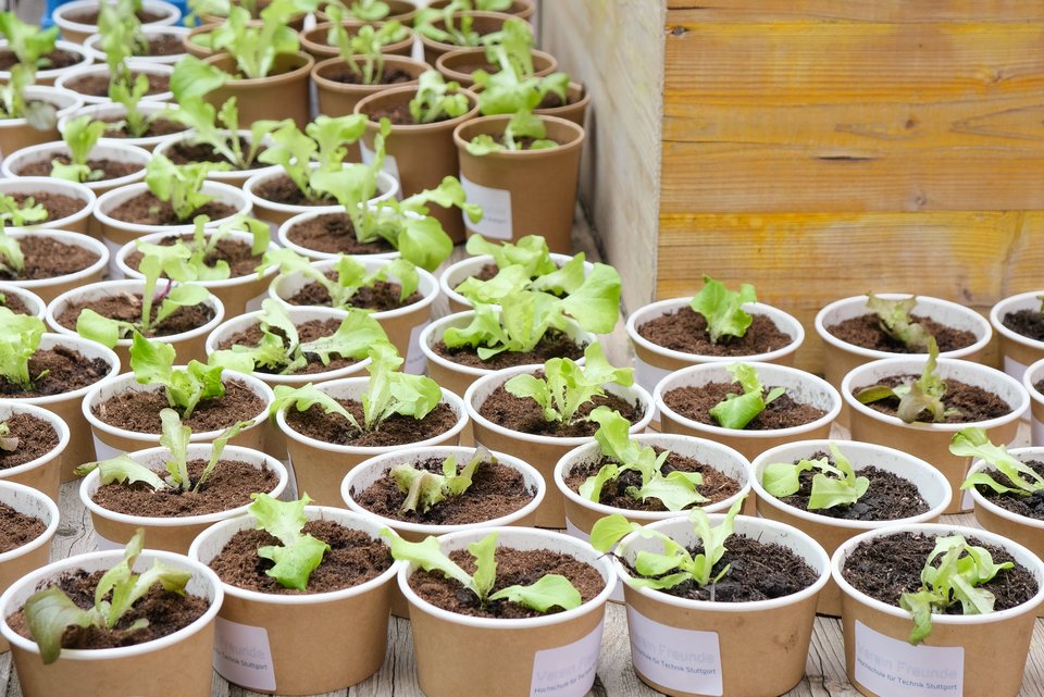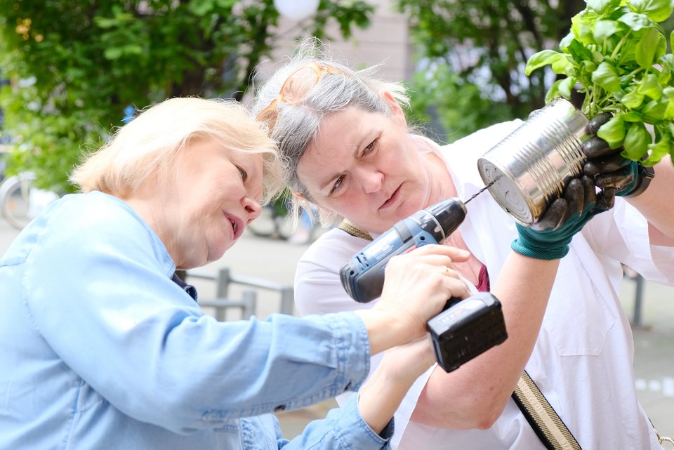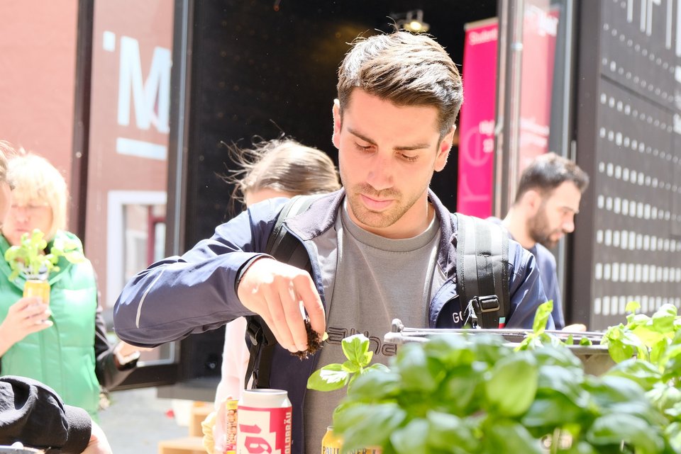 Hier stellte sich das Team hinter den grünen Projekten der Hochschule vor. Vor allem die DIY-Pflanzaktion war der Renner. Jede Menge Basilikumpflanzen warteten darauf, geteilt und in nachhaltige Gefäße, wie leere Spezi- oder auch San Miguel-Dosen, die mittels Dosenöffner eigens von Jonas Stave dafür präpariert wurden, eingepflanzt zu werden. Das Basilikum ging weg wie warme Semmeln (während diese am Nachbarstand ausgingen, aber dazu später). Ute Dettmann, Umweltbeauftragte der Hochschule, legte kurzerhand eine Bohrmaschine bereit, damit Löcher in die Dosen gebohrt werden konnten, um die zarten Pflänzchen vor Staunässe zu bewahren. Ihr Fazit zum Event: „Meine Erwartungen wurden übertroffen, auch vom Andrang her. Ich bin total begeistert, dass an der Hochschule so ein Event stattfindet.“ Jonas Stave ergänzt: „Es ist schön, unser Projekt „HFT goes green“ in so einem Rahmen einem breiteren Publikum vorstellen zu können. An unserem Stand kamen Leute vorbei, die bislang nichts von unserem Projekt wussten. Denen konnten wir ganz viel zeigen und erklären.“
