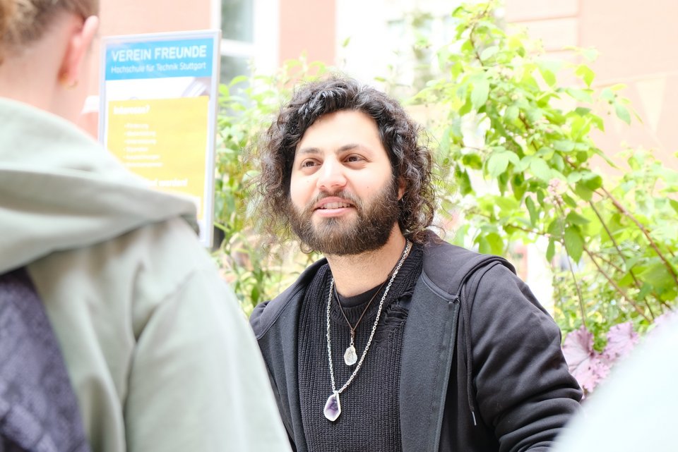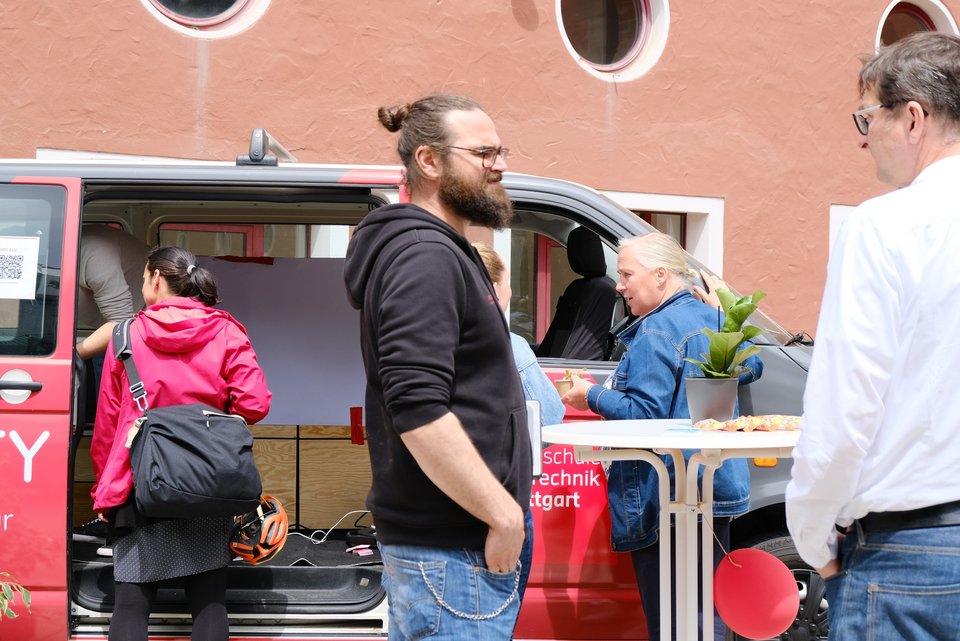 Als Kollegin und im gleichen Büro sitzend, habe ich von Anfang an alles hautnah mitbekommen. Vom ersten „Ich-habe-da-eine-Idee“ zur Namensgebung („HFT-Allee klingt doch toll, oder?“), von Absprachen hin zur immer konkreter werdenden Planung; es wurden Ideen verworfen, andere festgezurrt und alles in ein Gesamtkonzept gepackt. Und immer wieder der Blick in den Himmel und auf die Wetter-App. Doch Stuttgart zeigte sich am 25. Mai 2023 von seiner besten Seite: 20 Grad, Sonne, kein Regen. Traumwetter also für einen Bummel über die HFT-Allee, um die Stände zu besuchen und sich über das Angebot zu informieren.