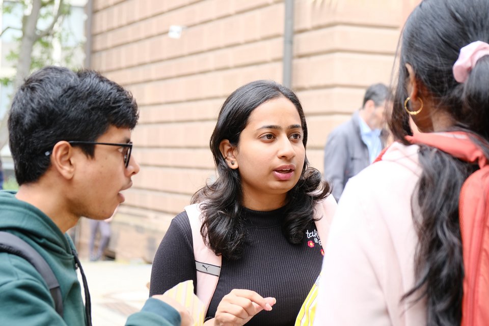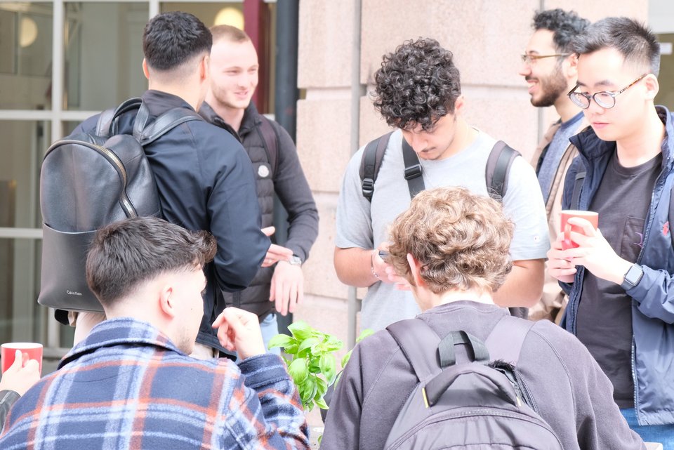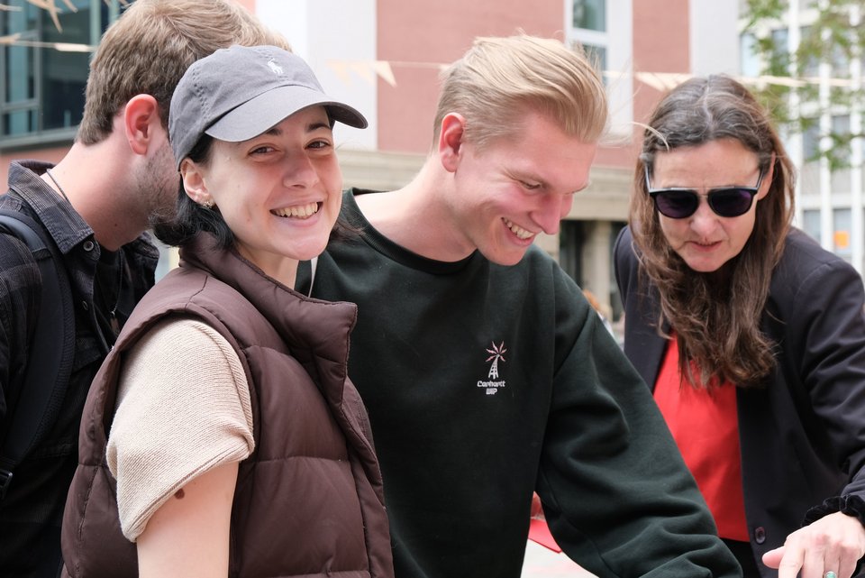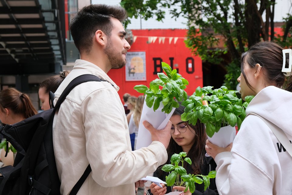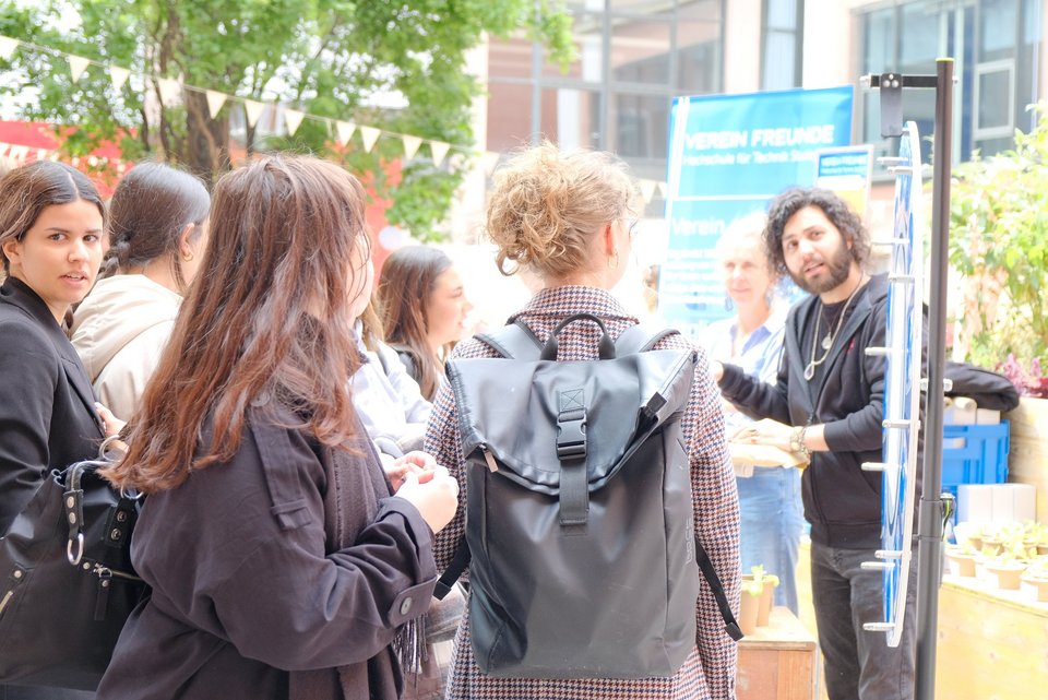 Die Vereinsmitglieder, die das Egle-Wohnheim betreiben und zahlreiche Aktionen und Preise innerhalb der Hochschule sponsern, lockten mit blauer Zuckerwatte und einem Glücksrad. Niemand ging leer aus: Eine Wasserflasche war der Hauptgewinn beim Feld „klimakompetent, resilient, vernetzt“, Salatpflanzen gab es für diejenigen, die auf den Feldern mit der Aufschrift „Verein Freunde“ landeten. Alle anderen freuten sich über Ahoi-Brausebonbons. Natürlich ging es auch darum, neue Mitglieder für den Verein zu gewinnen. Kaan Cuma Borazanci leistete dabei ganze Überzeugungsarbeit. Für ihn bietet eine Mitgliedschaft im Verein Freunde die beste Gelegenheit, sich zu connecten, Gemeinschaften zu bilden, um gemeinsame Erinnerungen zu schaffen und sich gegenseitig zu unterstützen. Das Fest findet er cool: „Es ist super gut aufgebaut, es herrscht mega gute Laune. Ich spüre nur positive Energie. Alle sind absolut happy!“