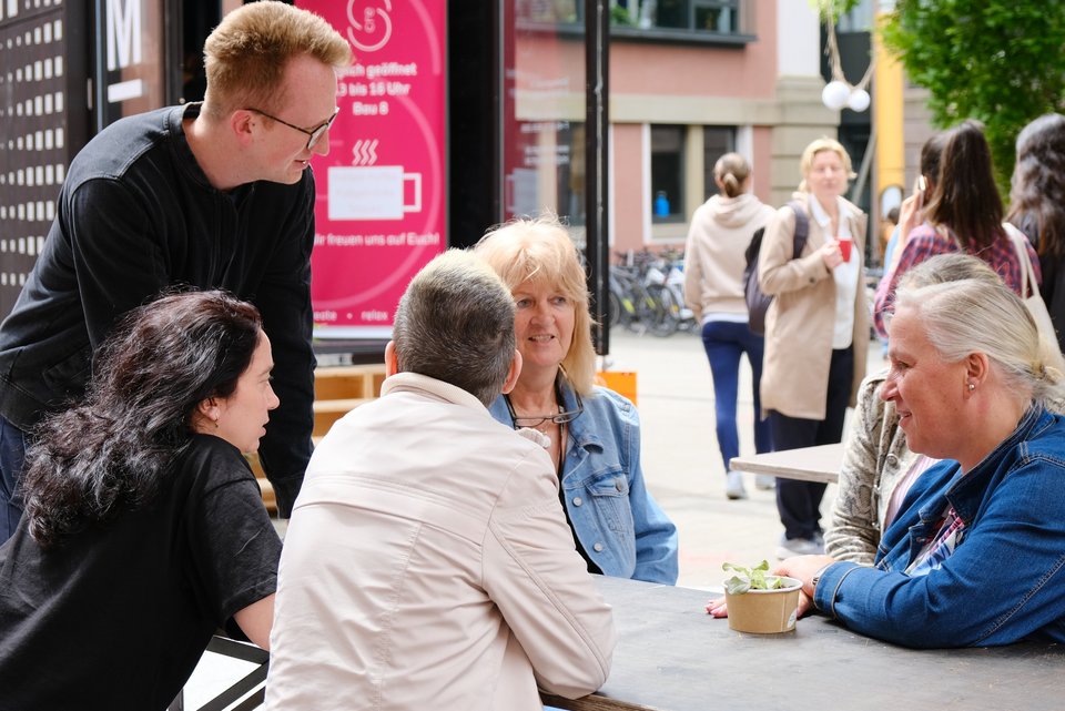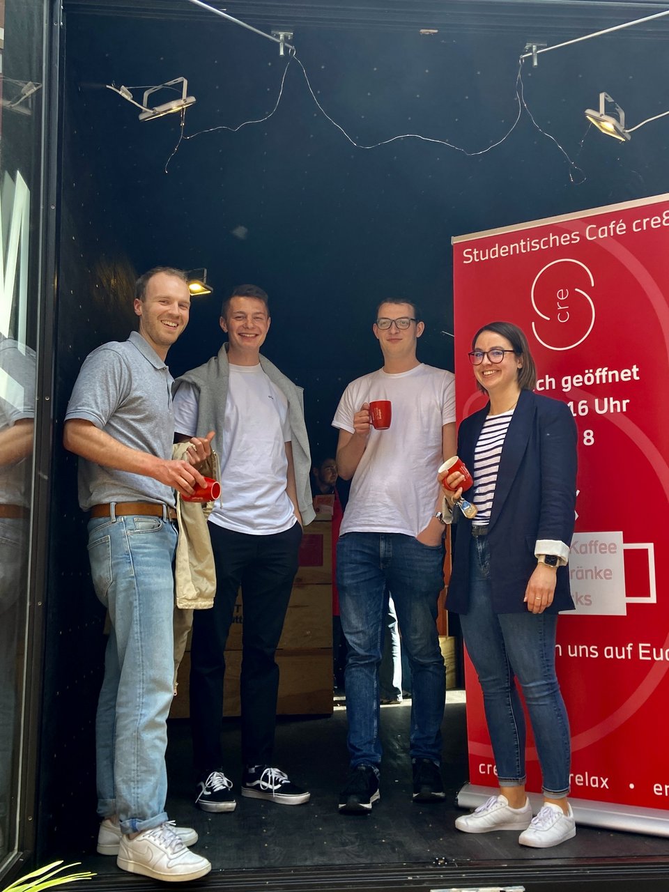 Cre8 nutzte die tolle Kulisse vom HFTMobil, um Besucher:innen mit köstlichen Kaffeespezialitäten zu versorgen. Special: Alumni und Studis im letzten Semester bekamen eine HFT-Tasse geschenkt! Der Andrang war groß. Die Stimmung der HFT-Allee war auch im Inneren des HFTMobils spürbar. Verena Glück, Studentin im Master-Studiengang Umweltorientierte Logistik, war in der zweiten Hälfte des Tages im Cre8-Team aktiv. Verena fand „die Stände mega cool“. Besonders gefreut hat sie jedoch zu sehen, „dass das Wort „vernetzt“, was überall auf den Boden im Innenhof gesprayt ist, ernst gemeint ist und gelebt wird.“