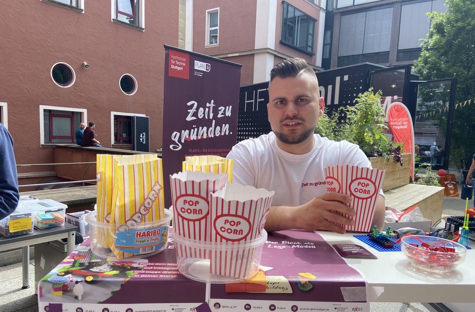 Wie man seine Ideen in ein Start-up umsetzt und richtig gründet, zeigten die Expert:innen von PlanG auf ihrem Stand. Sie hatten dazu Lego Serious Play dabei und präsentierten damit eine Methode, mit der das Team in der Beratung arbeitet. Mit den Lego-Elementen durften sich die Studierenden ihre Traum-Start-ups bauen. Doch das war noch nicht alles: Wer Lust auf eine Tüte salziges Popcorn hatte, musste einen QR-Code einscannen. Der führte zum Instagram-Account von PlanG. Wer den Follow-Button drückte, bekam dafür eine Tüte Popcorn. Ein Deal, mit dem Christine Kraus sehr zufrieden ist. „Wir haben jetzt schon mehr als 50 Popcorntüten rausgehauen, und es ist erst früher Mittag. Das Fest finde ich voll schön, das Wetter spielt mega mit. HFT-Allee ist eine bunte Sache, die Laune ist gut, und wir führen viele schöne Gespräche mit tollen Leuten.“